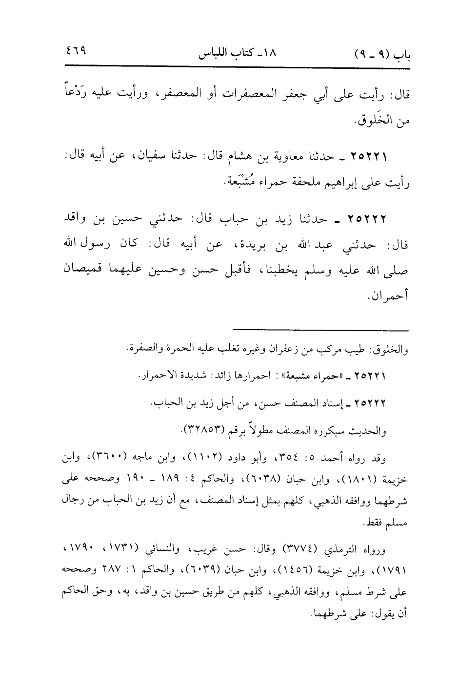 25222- حَدَّثَنَا زَيْدُ بْنُ حُبَابٍ ، قَالَ : حدَّثَنِي حُسَيْنُ بْنُ وَاقِدٍ ، قَالَ : حَدَّثَنِي عَبْدُ اللهِ بْنُ بُرَيْدَةَ ، عَنْ أَبِيهِ ، قَالَ : كَانَ رَسُولُ اللهِ صَلَّى الله عَلَيْهِ وَسَلَّمَ يَخْطُبُنَا ، فَأَقْبَلَ الْحَسَنُ وَالْحُسَيْنُ عَلَيْهِمَا قَمِيصَانِ أَحْمَرَانِ. (8/180.