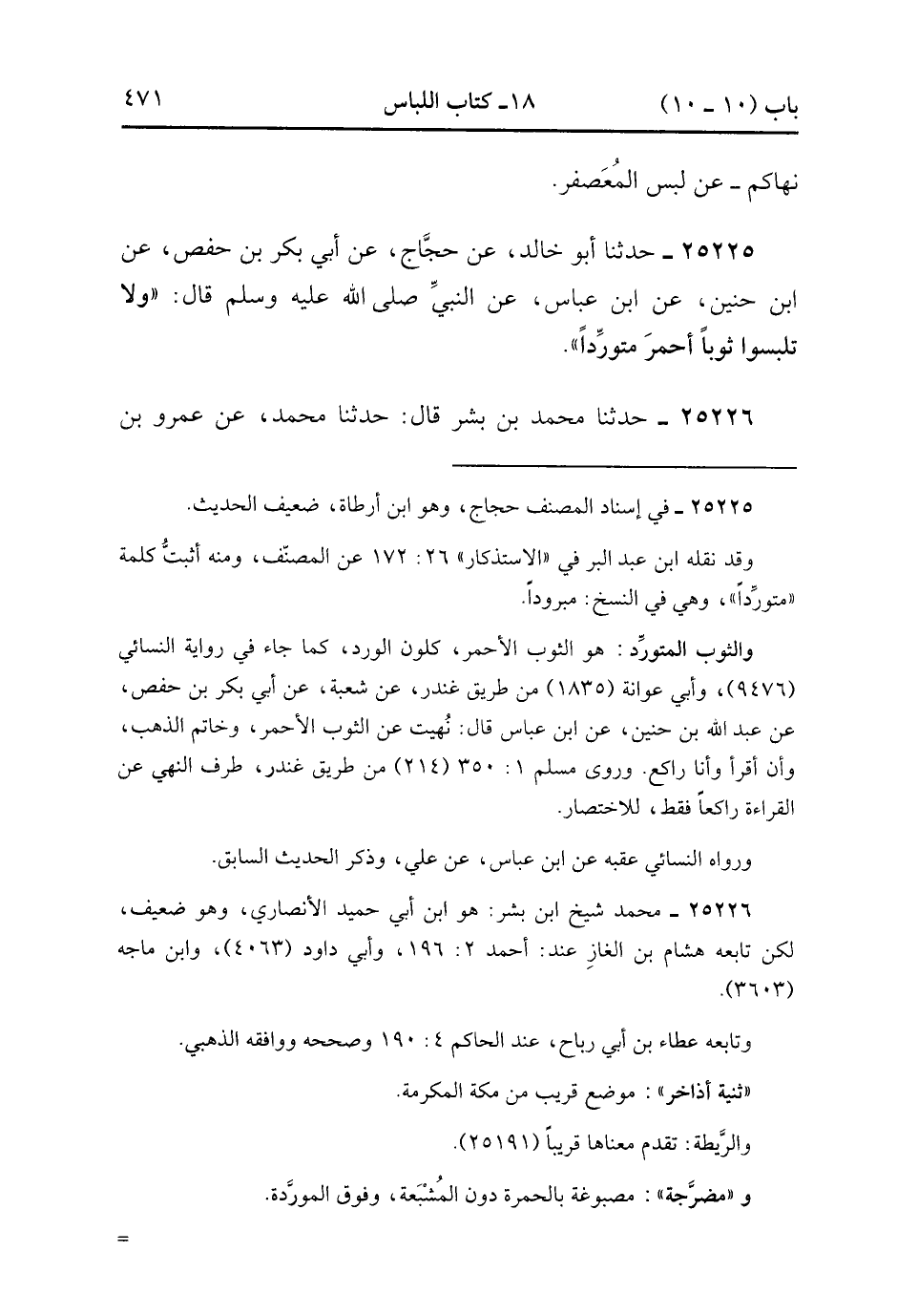 25225- حَدَّثَنَا أَبُو خَالِدٍ ، عَنْ حَجَّاجٍ ، عَنْ أَبِي بَكْرِ بْنِ حَفْصٍ ، عَنْ ابنِ حُنَيْنٍ ، عَنِ ابْنِ عَبَّاسٍ ، عَنِ النَّبِيِّ صَلَّى الله عَلَيْهِ وَسَلَّمَ ، قَالَ : لاَ تَلْبَسُوا ثَوْبًا أَحْمَرَ متَورِّدًا.