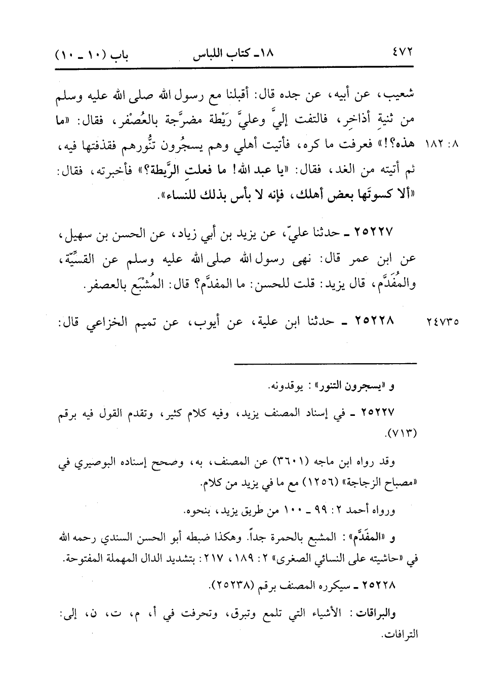 25227- حَدَّثَنَا عَلِيٌّ ، عَنْ يَزِيدَ بْنِ أَبِي زِيَادٍ ، عَنِ الْحَسَنِ بْنِ سُهَيْلٍ ، عَنِ ابْنِ عُمَرَ ، قَالَ : نَهَى رَسُولُ اللهِ صَلَّى الله عَلَيْهِ وَسَلَّمَ عَنِ الْقَسِّيَّةِ وَالْمُفَدَّمِ ، قَالَ يَزِيدُ : قُلْتُ لِلْحَسَنِ : مَا الْمُفَدَّمُ ؟ قَالَ : الْمُشَبَّعُ بِالْعُصْفُرِ.