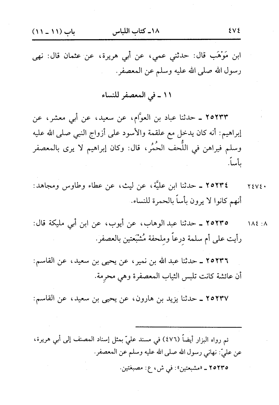 25236- حَدَّثَنَا عَبْدُ اللهِ بْنُ نُمَيْرٍ ، عَنْ يَحْيَى بْنِ سَعِيدٍ ، عَنِ الْقَاسِمِ ؛ أَنَّ عَائِشَةَ كَانَتْ تَلْبَسُ الثِّيَابَ الْمُعَصْفَرَةَ ، وَهِيَ مُحْرِمَةٌ.