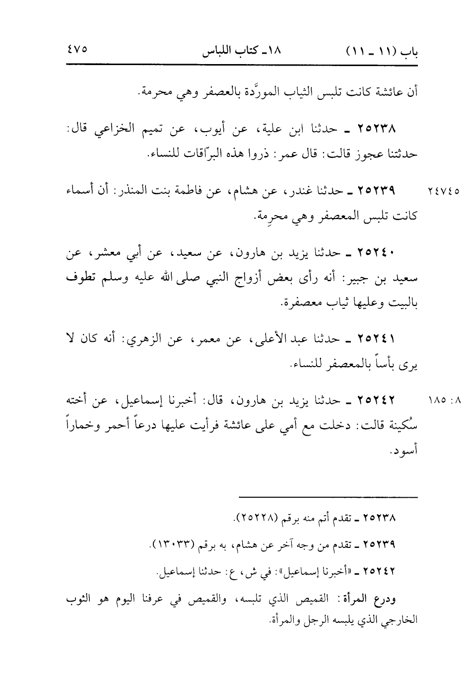 25240- حَدَّثَنَا يَزِيدُ بْنُ هَارُونَ ، عَنْ سَعِيدٍ ، عَنْ أَبِي مَعْشَرٍ ، عَنْ سَعِيدِ بْنِ جُبَيْرٍ ؛ أَنَّهُ رَأَى بَعْضَ أَزْوَاجِ النَّبِيِّ صَلَّى الله عَلَيْهِ وَسَلَّمَ تَطُوفُ بِالْبَيْتِ ، وَعَلَيْهَا ثِيَابٌ مُعَصْفَرَةٌ.
