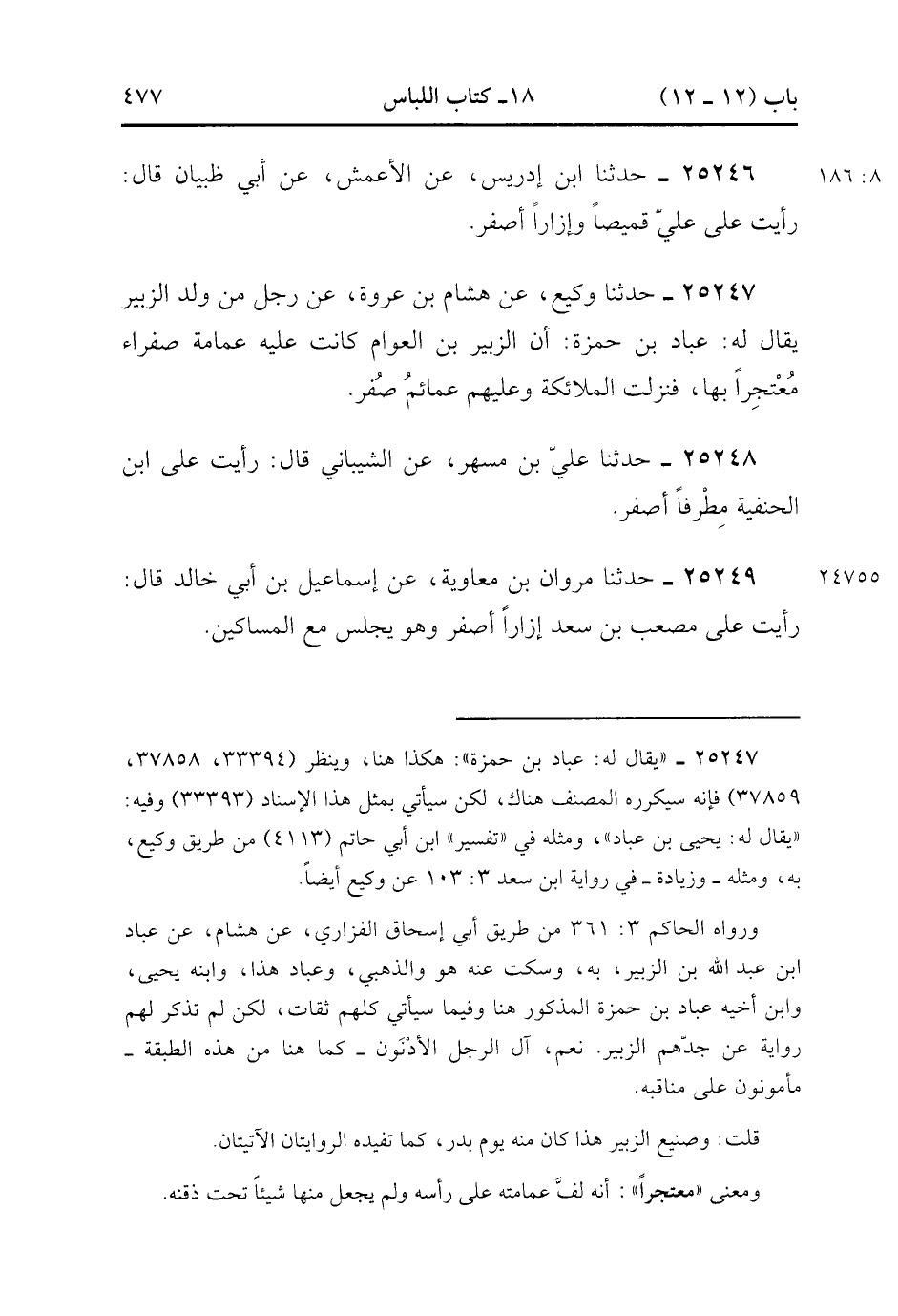 25247- حَدَّثَنَا وَكِيعٌ ، عَنْ هِشَامِ بْنِ عُرْوَةَ ، عَنْ رَجُلٍ مِنْ وَلَدِ الزُّبَيْرِ ، يُقَالَ لَهُ : عَبَّادُ بْنُ حَمْزَةَ ؛ أَنَّ الزُّبَيْرَ بْنَ الْعَوَّامِ كَانَتْ عَلَيْهِ عِمَامَةٌ صَفْرَاءُ مُعْتَجِرًا بِهَا ، فَنَزَلَتِ الْمَلاَئِكَةُ وَعَلَيْهِمْ عَمَائِمُ صُفْرٌ.