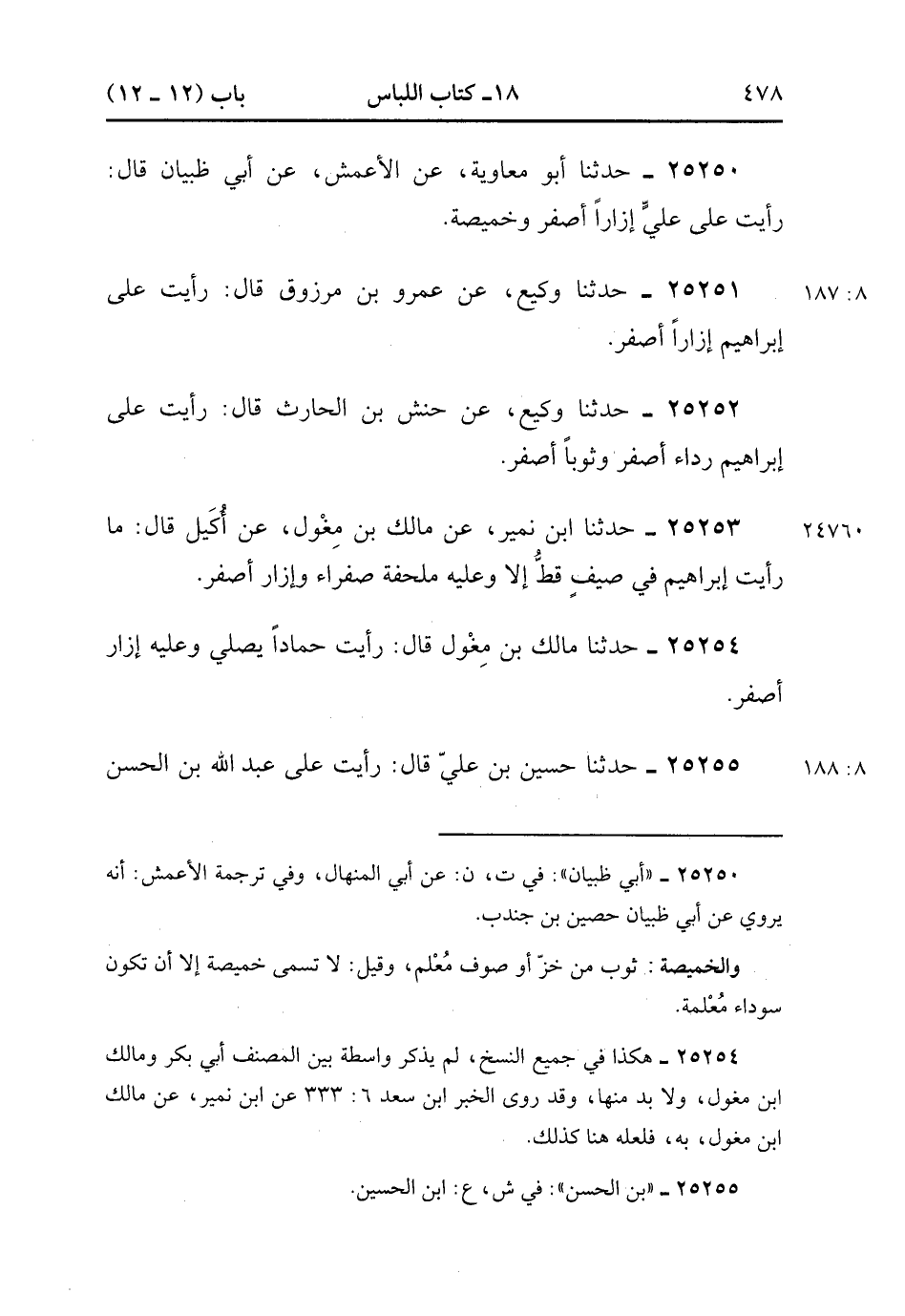 25254- حَدَّثَنَا ابْنُ نُمَيْرٍ (1) ، حَدَّثَنَا مَالِكُ بْنُ مِغْوَلٍ ، قَالَ : رَأَيْتُ حَمَّادًا يُصَلِّي وَعَلَيْهِ إِزَارٌ أَصْفَرُ. (8/187)
