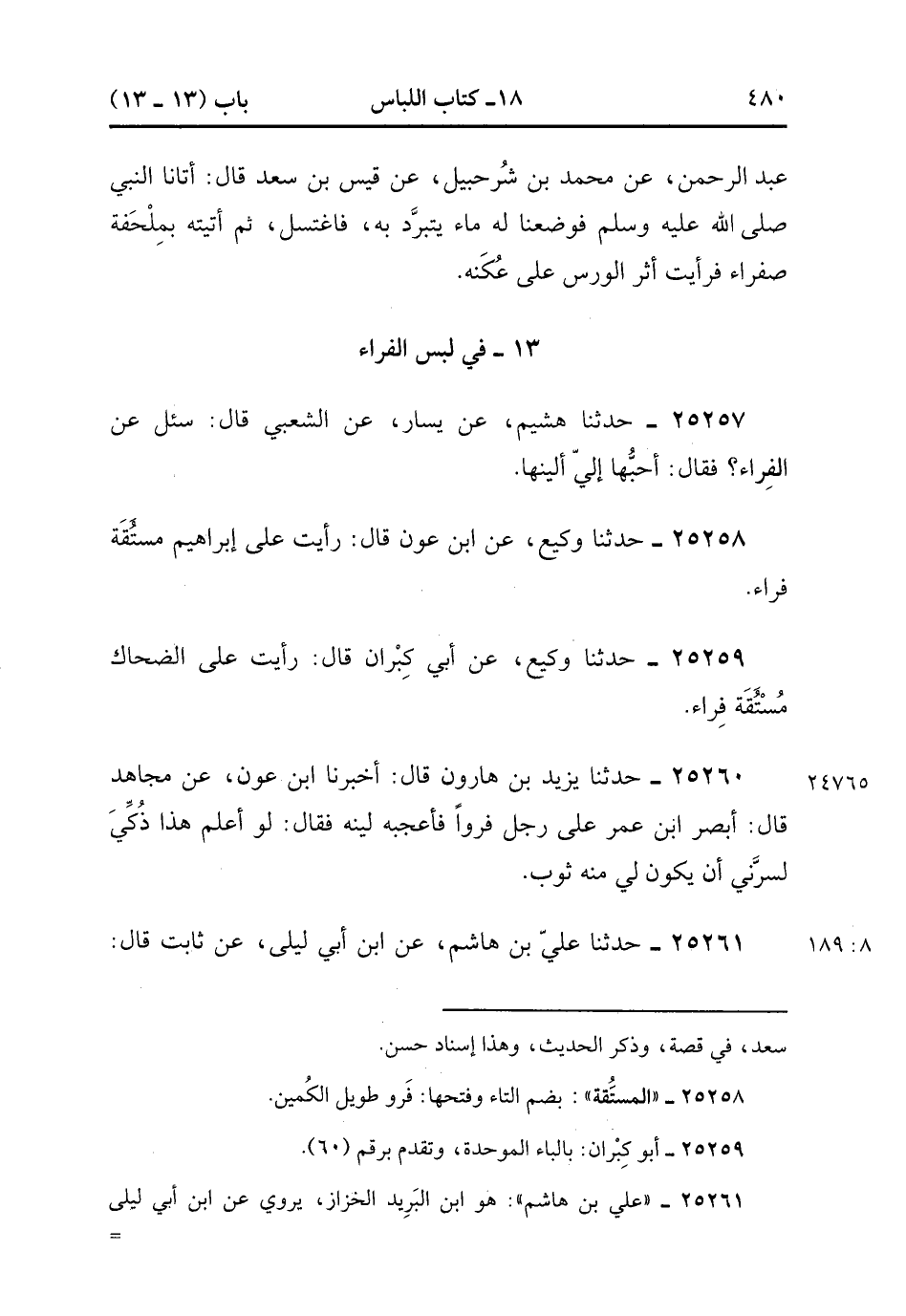 25260- حَدَّثَنَا يَزِيدُ بْنُ هَارُونَ , قَالَ : أَخْبَرَنَا ابْنُ عَوْنٍ ، عَنْ مُجَاهِدٍ ، قَالَ : أَبْصَرَ ابْنُ عُمَرَ عَلَى رَجُلٍ فَرْوًا فَأَعْجَبَهُ لِينُهُ ، فَقَالَ : لَوْ أَعْلَمُ هَذَا ذُكِّيَ لَسَرَّنِي أَنْ يَكُونَ لِي مِنْهُ ثَوْبٌ.(8/188.