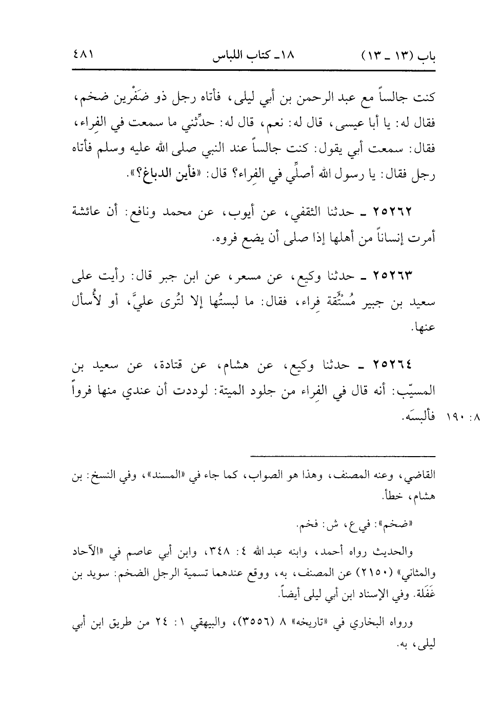 25261- حَدَّثَنَا عَلِيُّ بْنُ هَاشِمٍ ، عَنِ ابْنِ أَبِي لَيْلَى ، عَنْ ثَابِتٍ ، قَالَ : كُنْتُ جَالِسًا مَعَ عَبْدِ الرَّحْمَنِ بْنِ أَبِي لَيْلَى ، فَأَتَاهُ رَجُلٌ ذُو ضَفْرَيْنِ ضَخْمٌ ، فَقَالَ لَهُ : يَا أَبَا عِيسَى ، قَالَ لَهُ : نَعَمْ ، قَالَ لَهُ : حَدِّثْنِي مَا سَمِعْتَ فِي الْفِرَاءِ ، فَقَالَ : سَمِعْتُ أَبِي يَقُولُ : كُنْتُ جَالِسًا عِنْدَ النَّبِيِّ صَلَّى الله عَلَيْهِ وَسَلَّمَ فَأَتَاهُ رَجُلٌ فَقَالَ : يَا رَسُولَ اللهِ ، أُصَلِّي فِي الْفِرَاءِ ؟ قَالَ : فَأَيْنَ الدِّبَاغُ ؟.