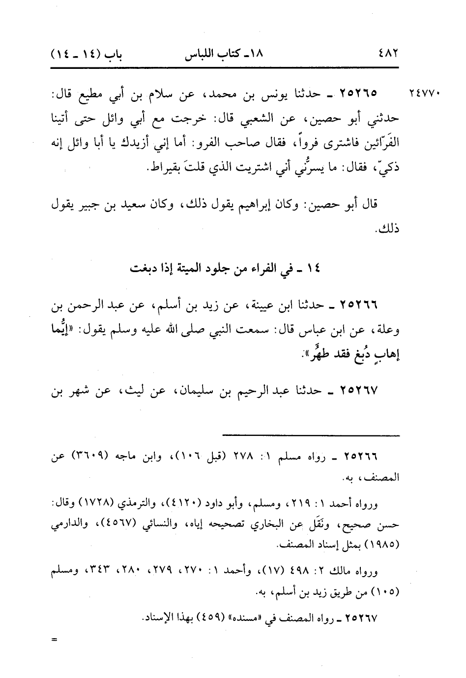 25266- حَدَّثَنَا ابْنُ عُيَيْنَةَ ، عَنْ زَيْدِ بْنِ أَسْلَمَ ، عْن عَبْدِ الرَّحْمَنِ بْنِ وَعْلَةَ ، عَنِ ابْنِ عَبَّاسٍ ، قَالَ : سَمِعْتُ النَّبِيَّ صَلَّى الله عَلَيْهِ وَسَلَّمَ يَقُولُ : أَيُّمَا إِهَابٍ دُبِغَ ، فَقَدْ طَهُرَ.