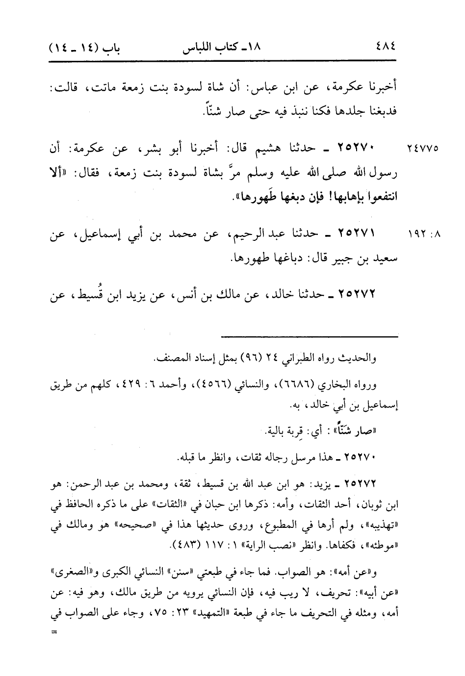 25270- حَدَّثَنَا هُشَيْمٌ ، قَالَ : أَنْبَأَنا أَبُو بِشْرٍ ، عَنْ عِكْرِمَةَ ؛ أَنَّ رَسُولَ اللهِ صَلَّى الله عَلَيْهِ وَسَلَّمَ مَرَّ بِشَاةٍ لِسَوْدَةِ بِنْتِ زَمْعَةَ ، فَقَالَ : أَلاَ انْتَفَعُوا بِإِهَابِهَا ، فَإِنَّ دَبْغَهَا طَهُورُهَا.(8/191)