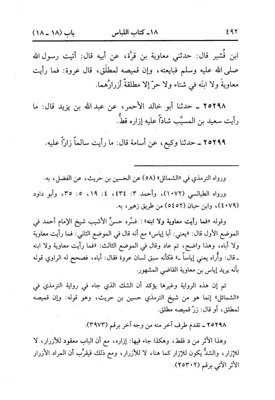 25297- حَدَّثَنَا الْفَضْلُ بْنُ دُكَيْنِ ، عَنْ زُهَيْرٍ ، عَنْ عُرْوَةَ بْنِ عَبْدِ اللهِ بْنِ قُشَيْرٍ ، قَالَ : حدَّثَنِي مُعَاوِيَةُ بْنُ قُرَّةَ ، عَنْ أَبِيهِ ، قَالَ : أَتَيْتُ رَسُولَ اللهِ صَلَّى الله عَلَيْهِ وَسَلَّمَ فَبَايَعْتُهُ ، وَإِنَّ قَمِيصَهُ لَمُطْلَقٌ ، قَالَ عُرْوَةُ : فَمَا رَأَيْتُ مُعَاوِيَةَ ، وَلاَ ابْنَهُ فِي شِتَاءٍ ، وَلاَ حَرٍّ إِلاَّ مُطْلَقَةً أَزْرَارُهُمَا.(8/197)