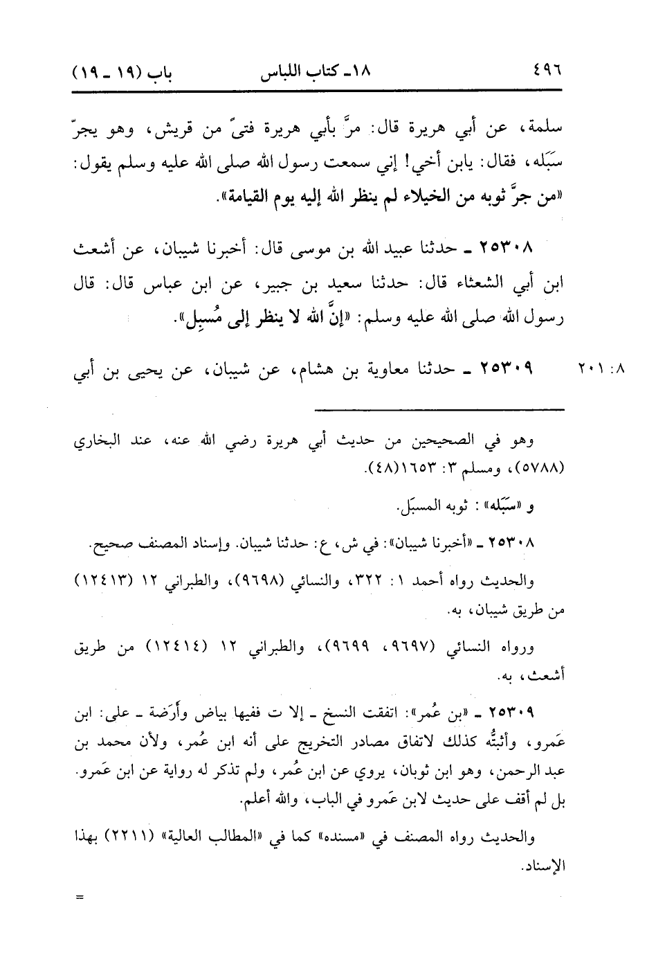 25309- حَدَّثَنَا مُعَاوِيَةَ بْنُ هِشَامٍ ، عَنْ شَيْبَانَ ، عَنْ يَحْيَى بْنِ أَبِي كَثِيرٍ ، عنْ مُحَمَّدِ بْنِ عَبْدِ الرَّحْمَنِ ، أَنَّهُ سَمِعَ عَبْدَ اللهِ بْنَ عُمَرَ يَقُولُ : قَالَ رَسُولُ اللهِ صَلَّى الله عَلَيْهِ وَسَلَّمَ : لاَ يَنْظُرُ اللَّهُ إِلَى الَّذِي يَجُرُّ إِزَارَهُ خُيَلاَءَ. (8/201).