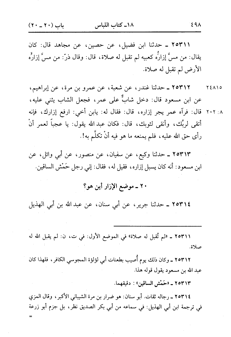 25313- حَدَّثَنَا وَكِيعٌ ، عَنْ سُفْيَانَ ، عَنْ مَنْصُورٍ ، عَنْ أَبِي وَائِلٍ ، عَنِ ابْنِ مَسْعُودٍ ؛ أَنَّهُ كَانَ يُسْبِلُ إِزَارَهُ ، فَقِيلَ لَهُ ، فَقَالَ : إِنِّي رَجُلٌ حَمِشُ السَّاقَيْنِ. (8/202).