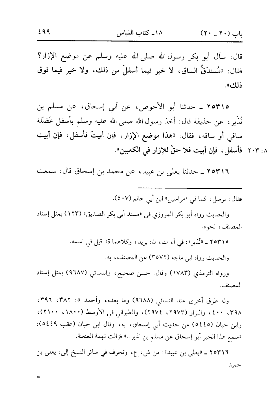 25315- حَدَّثَنَا أَبُو الأَحْوَصِ ، عَنْ أَبِي إِسْحَاقَ ، عَنْ مُسْلِمِ بْنِ نُذَيْرٍ ، عَنْ حُذَيْفَةَ ، قَالَ : أَخَذَ رَسُولُ اللهِ صَلَّى الله عَلَيْهِ وَسَلَّمَ بِأَسْفَلِ عَضَلَةِ سَاقِي ، أَوْ سَاقِهِ ، فَقَالَ : هَذَا مَوْضِعُ الإِزَارِ ، فَإِنْ أَبَيْتَ فَأَسْفَلَ ، فَإِنْ أَبَيْتَ فَأَسْفَلَ ، فَإِنْ أَبَيْتَ فَلاَ حَقَّ للإِزَارِ فِي الْكَعْبَيْنِ. (8/202).
