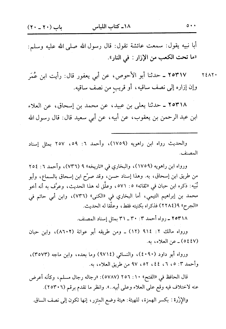25318- حَدَّثَنَا يَعْلَى بْنُ عُبَيْدٍ ، عَنْ مُحَمَّدِ بْنِ إِسْحَاقَ ، عَنِ الْعَلاَءِ بْنِ عَبْدِ الرَّحْمَنِ بْنِ يَعْقُوبَ ، عَنْ أَبِيهِ ، عَنْ أَبِي سَعِيدٍ ، قَالَ : قَالَ رَسُولُ اللهِ صَلَّى الله عَلَيْهِ وَسَلَّمَ : إِزْرَةُ الْمُؤْمِنِ إِلَى نِصْفِ السَّاقِ ، فَمَا كَانَ إِلَى الْكَعْبِ فَلاَ بَأْسَ ، وَمَا كَانَ تَحْتَ الْكَعْبِ فَفِي النَّارِ. (8/203).