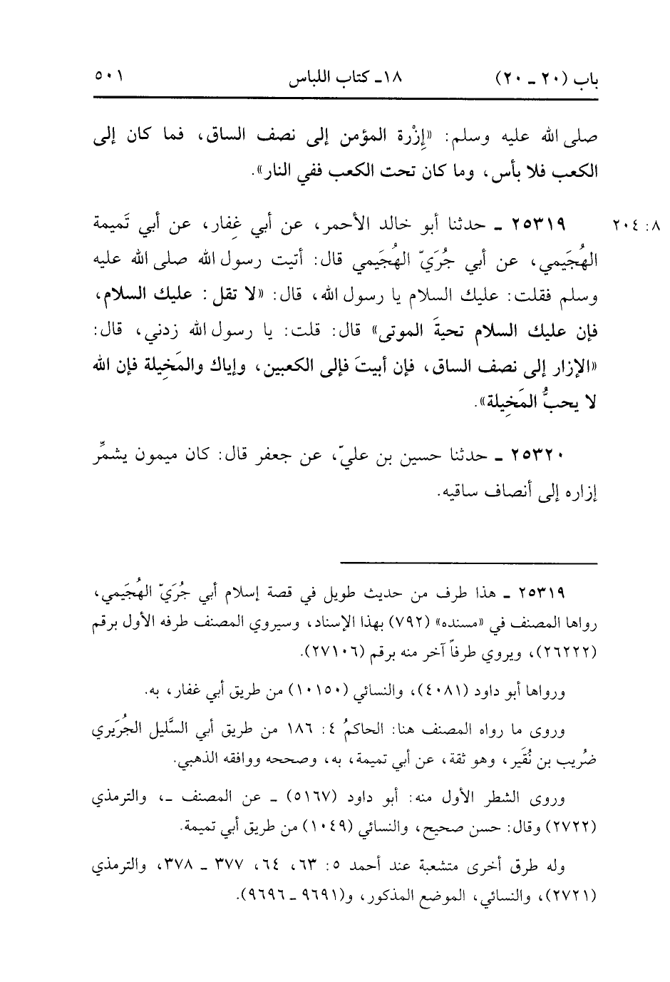 25319- حَدَّثَنَا أَبُو خَالِدٍ الأَحْمَرُ ، عَنْ أَبِي غِفَارٍ ، عَنْ أَبِي تَمِيمَةَ الْهُجَيْمِيِّ ، عَنْ أَبِي جُرَيٍّ الْهُجَيْمِيِّ ، قَالَ : أَتَيْتُ رَسُولَ اللهِ صَلَّى الله عَلَيْهِ وَسَلَّمَ فَقُلْتُ : عَلَيْكَ السَّلاَمُ يَا رَسُولَ اللهِ ، قَالَ : لاَ تَقُلْ : عَلَيْك السَّلاَمُ ؟ فَإِنَّ عَلَيْك السَّلاَمُ تَحِيَّةُ الْمَوتَى ، قَالَ : قُلْتُ : يَا رَسُولَ اللهِ ، زِدْنِي ، قَالَ : الإِزَارُ إِلَى نِصْفِ السَّاقِ ، فَإِنْ أَبَيتَ فَإِلَى الْكَعْبِين ، وَإِيَّاكَ وَالْمَخِيلَةِ ، فَإِنَّ الله لاَ يُحِب الْمَخِيلَةِ. (8/203).