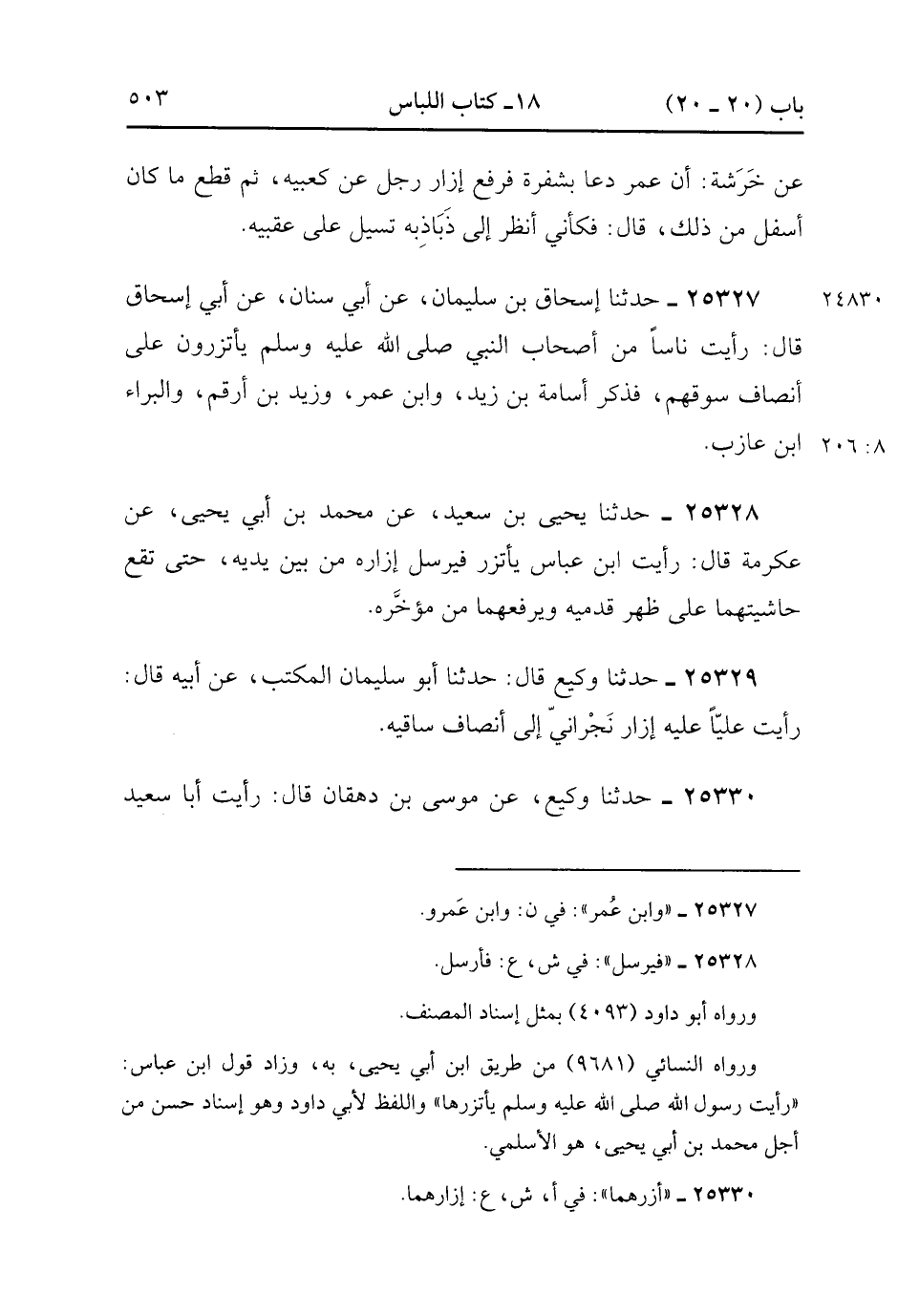 25327- حَدَّثَنَا إِسْحَاقُ بْنُ سُلَيْمَانَ ، عَنْ أَبِي سِنَانٍ ، عَنْ أَبِي إِسْحَاقَ ، قَالَ : رَأَيْتُ نَاسًا مِنْ أَصْحَابِ رَسُولِ اللهِ صَلَّى الله عَلَيْهِ وَسَلَّمَ يَأْتَزِرُونَ عَلَى أَنْصَافِ سُوقِهِمْ ، فَذَكَرَ أُسَامَةَ بْنَ زَيْدٍ ، وَابْنَ عُمَرَ ، وَزَيْدَ بْنَ أَرْقَمَ ، وَالْبَرَاءَ بْنَ عَازِبٍ. (8/205).