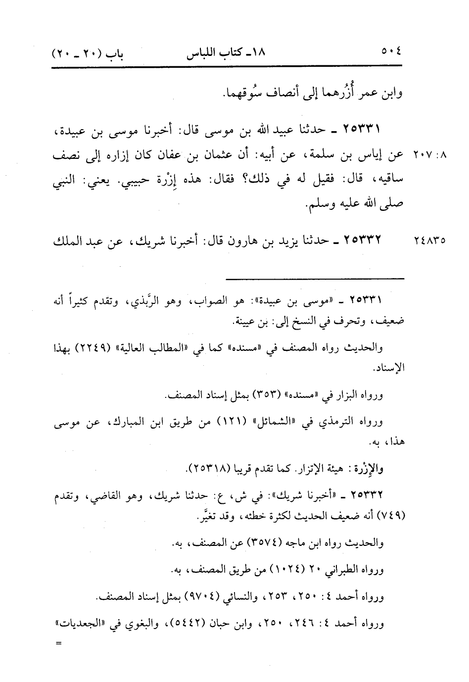 25331- حَدَّثَنَا عُبَيْدُ اللهِ بْنُ مُوسَى , قَالَ : أَخْبَرَنَا مُوسَى بْنُ عُبَيْدَةَ ، عَنْ إيَاسِ بْنِ سَلَمَةَ ، عَنْ أَبِيهِ ؛ أَنَّ عُثْمَانَ بْنَ عَفَّانَ كَانَ إِزَارُهُ إِلَى نِصْفِ سَاقَيْهِ ، قَالَ : فَقِيلَ لَهُ فِي ذَلِكَ ؟ فَقَالَ : هَذِهِ إِزَرَةُ حَبِيبِي ، يَعْنِي النَّبِيَّ صَلَّى الله عَلَيْهِ وَسَلَّمَ. (8/206).