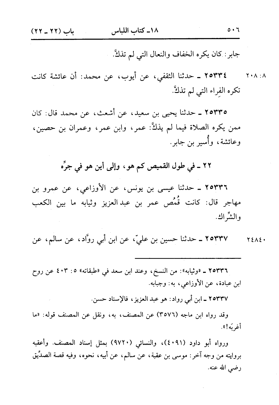 25336- حَدَّثَنَا عِيسَى بْنُ يُونُسَ ، عَنِ الأَوْزَاعِيِّ ، عَنْ عَمْرِو بْنِ مُهَاجِرٍ ، قَالَ : كَانَتْ قُمُصُ عُمَرَ بْنِ عَبْدِ الْعَزِيزِ وَثِيَابُهُ مَا بَيْنَ الْكَعْبِ وَالشِّرَاكِ.