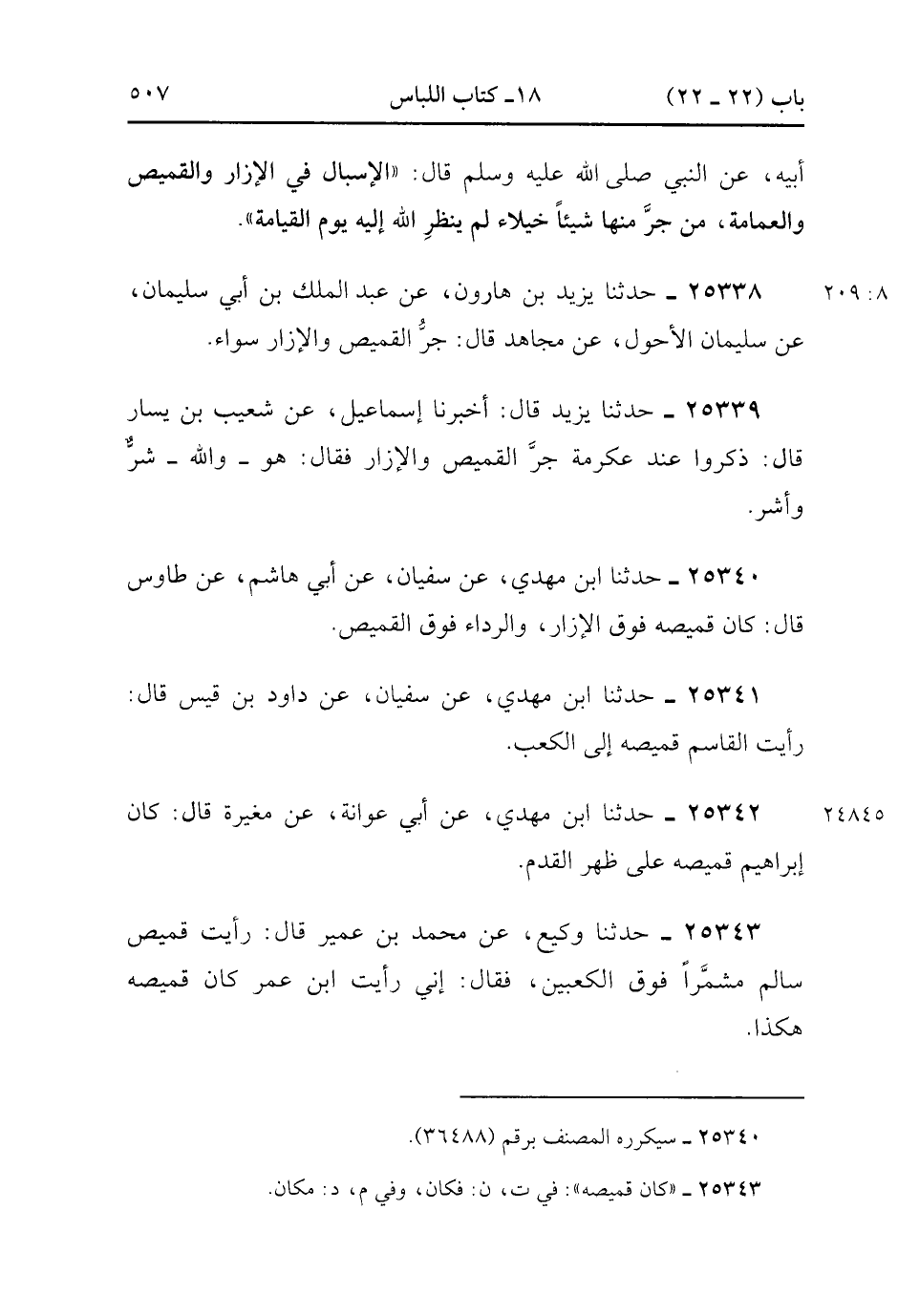 25338- حَدَّثَنَا يَزِيدُ بْنُ هَارُونَ ، عَنْ عَبْدِ الْمَلِكِ بْنِ أَبِي سُلَيْمَانَ ، عَنْ سُلَيْمَانَ الأَحْوَلِ ، عَنْ مُجَاهِدٍ ، قَالَ : جَرُّ الْقَمِيصِ وَالإِزَارِ سَوَاءٌ.