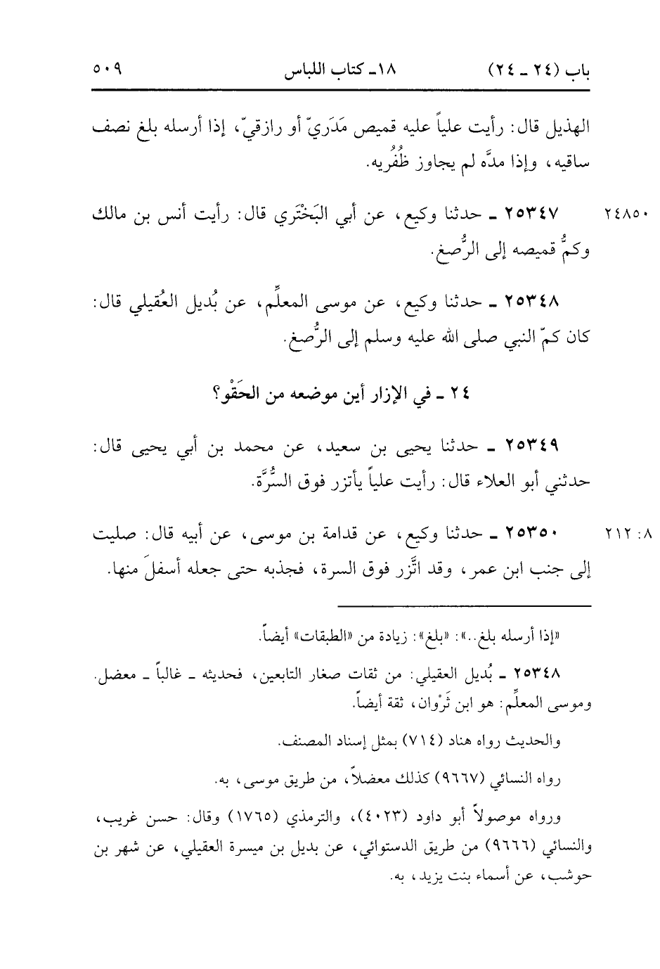 25348- حَدَّثَنَا وَكِيعٌ ، عَنْ مُوسَى الْمُعَلِّمِ ، عَنْ بُدَيْلٍ الْعُقَيْلِيِّ ، قَالَ : كَانَ كُمُّ النَّبِيِّ صَلَّى الله عَلَيْهِ وَسَلَّمَ إِلَى الرَّصْغِ.