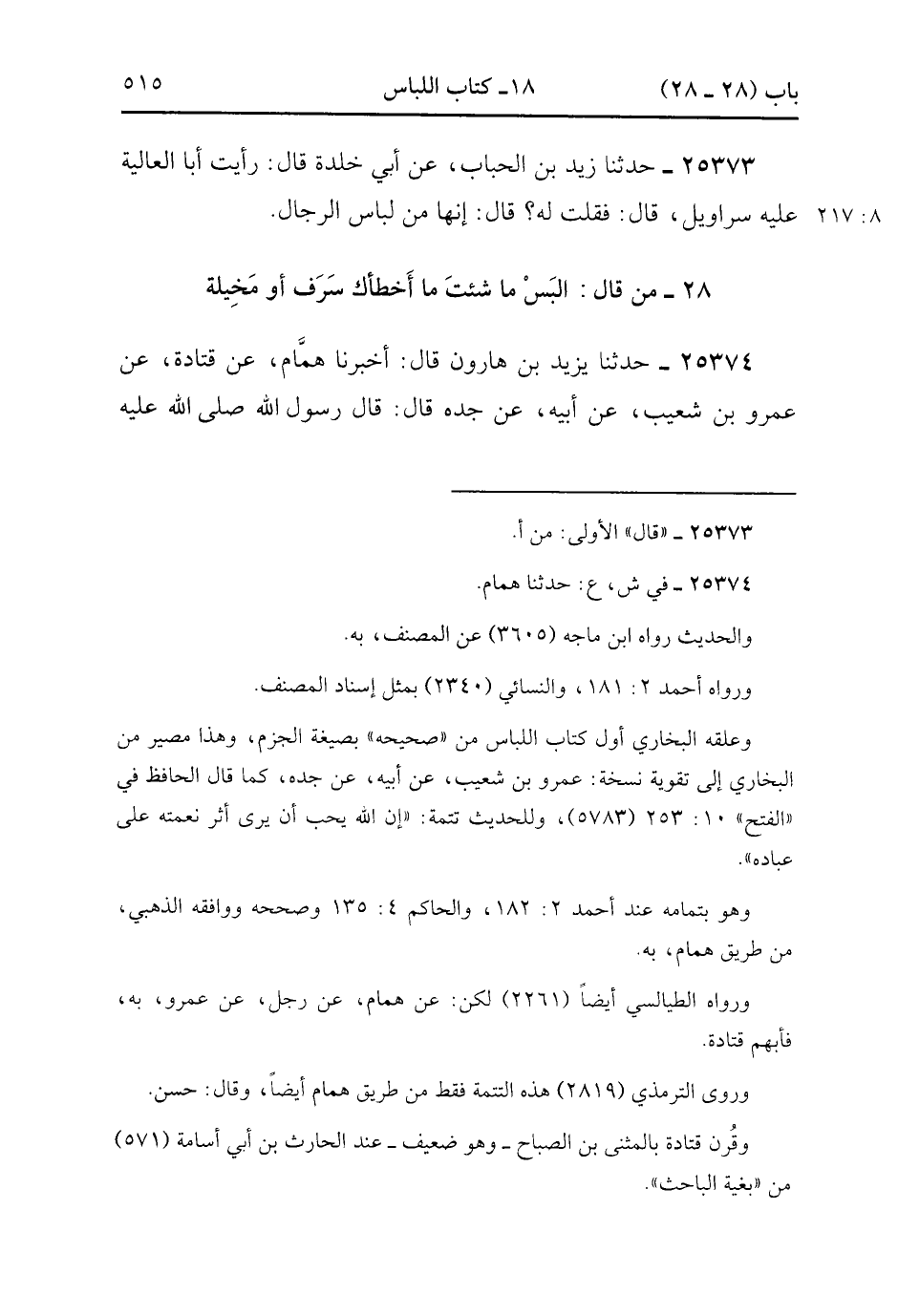 25374- حَدَّثَنَا يَزِيدُ بْنُ هَارُونَ , قَالَ : أَخْبَرَنَا هَمَّامٌ ، عَنْ قَتَادَةَ ، عَنْ عَمْرِو بْنِ شُعَيْبٍ ، عَنْ أَبِيهِ ، عَنْ جَدِّهِ ، قَالَ : قَالَ رَسُولُ اللهِ صَلَّى الله عَلَيْهِ وَسَلَّمَ : كُلُوا وَاشْرَبُوا وَتَصَدَّقُوا ، وَالْبَسُوا مَا لَمْ يُخَالِطْهُ إِسْرَافٌ ، وَلاَ مَخِيلَةٌ. (8/217).