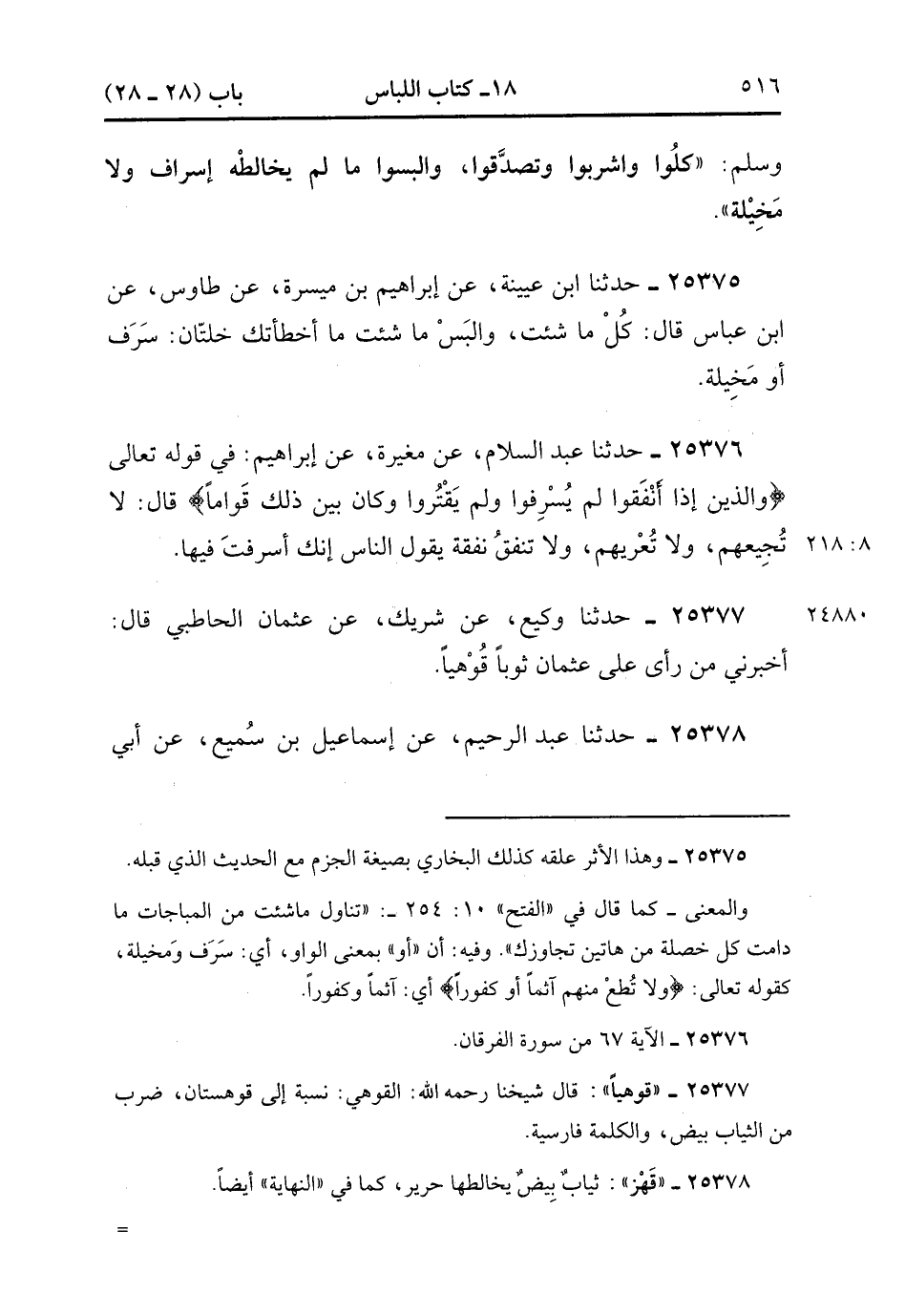 25375- حَدَّثَنَا ابْنُ عُيَيْنَةَ ، عَنْ إِبْرَاهِيمَ بْنِ مَيْسَرَةَ ، عَنْ طَاوُوسٍ ، عَنِ ابْنِ عَبَّاسٍ ، قَالَ : كُلْ مَا شِئْتَ ، وَالْبَسْ مَا شِئْتَ ، مَا أَخْطَأَتْك خُلَّتَانِ : سَرَفٌ ، أَوْ مَخِيلَةٌ.