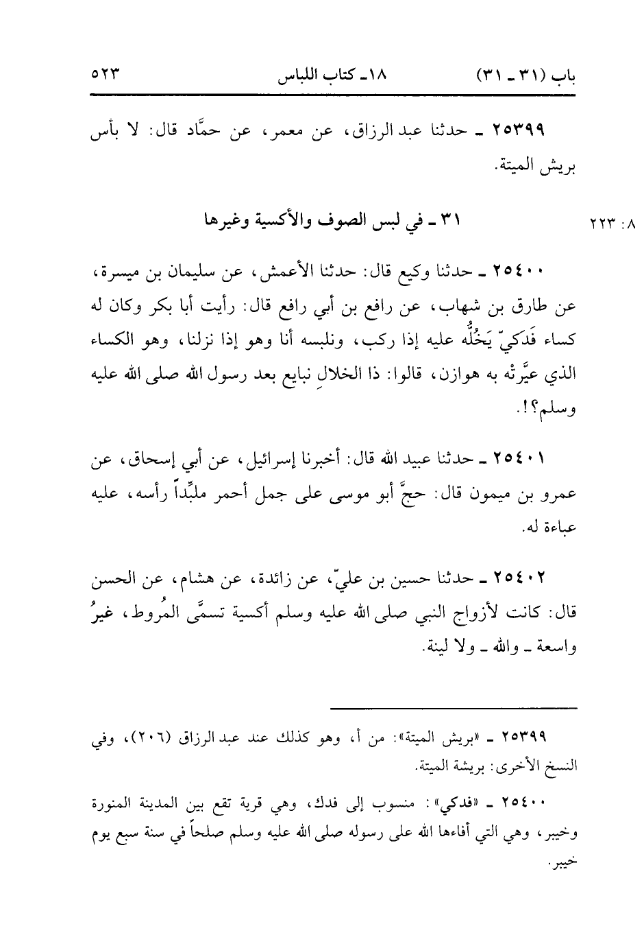 25402- حَدَّثَنَا حُسَيْنُ بْنُ عَلِيٍّ ، عَنْ زَائِدَةَ ، عَنْ هِشَامٍ ، عَنِ الْحَسَنِ ، قَالَ : كَانَتْ لأَزْوَاجِ النَّبِيِّ صَلَّى الله عَلَيْهِ وَسَلَّمَ أَكْسِيَةٌ تُسَمَّى الْمُرُوطَ غَيْرُ وَاسِعَةٍ وَاللَّهِ ، وَلاَ لَيِّنَةٍ. (8/223).