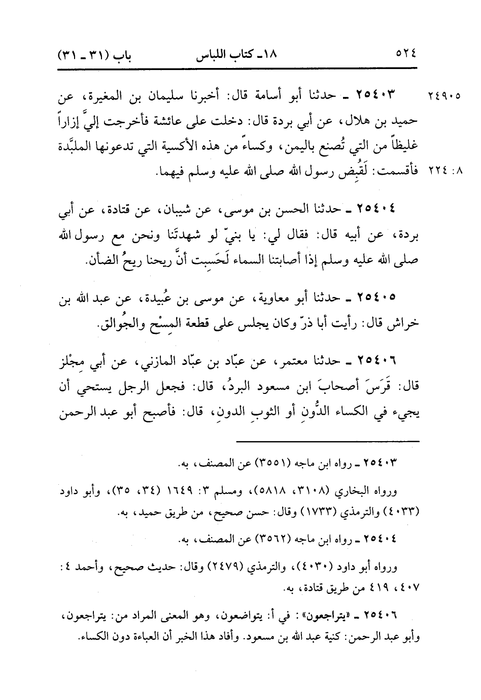 25403- حَدَّثَنَا أَبُو أُسَامَةَ , قَالَ : أَخْبَرَنَا سُلَيْمَانُ بْنُ الْمُغِيرَةَ ، عَنْ حُمَيْدِ بْنِ هِلاَلٍ ، عَنْ أَبِي بُرْدَةَ ، قَالَ : دَخَلْتُ عَلَى عَائِشَةَ فَأَخْرَجَتْ إِلَيَّ إِزَارًا غَلِيظًا مِنَ الَّتِي تُصْنَعُ بِالْيَمَنِ ، وَكِسَاءً مِنْ هَذِهِ الأَكْسِيَةِ الَّتِي تَدْعُونَهَا الْمُلَبَّدَةَ ، فَأَقْسَمَتْ : لَقُبِضَ رَسُولُ اللهِ صَلَّى الله عَلَيْهِ وَسَلَّمَ فِيهِمَا. (8/223).