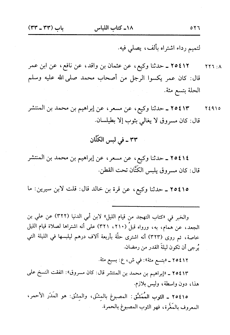 25415- حَدَّثَنَا وَكِيعٌ ، عَنْ قُرَّةَ بْنِ خَالِدٍ ، قَالَ : قُلْتُ لاِبْنِ سِيرِينَ : مَا كَانَ لِبَاسُ أَبِي هُرَيْرَةَ ؟ قَالَ : مِثْلَ ثَوْبَيَّ هَذَيْنِ ، وَعَلَيْهِ ثَوْبَانِ كَتَّانٍ مُمَشَّقَانِ ، فَتَمَخَّطَ مَرَّةً ، فَقَالَ : بَخٍ ، بَخٍ ، يَتَمَخَّطُ أَبُو هُرَيْرَةَ فِي الْكَتَّانِ. (8/226).