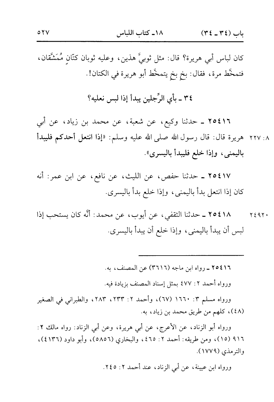 25416- حَدَّثَنَا وَكِيعٌ ، عَنْ شُعْبَةَ ، عَنْ مُحَمَّدِ بْنِ زِيَادٍ ، عَنْ أَبِي هُرَيْرَةَ ، قَالَ : قَالَ رَسُولُ اللهِ صَلَّى الله عَلَيْهِ وَسَلَّمَ : إِذَا انْتَعَلَ أَحَدُكُمْ فَلْيَبْدَأْ بِالْيُمْنَى ، وَإِذَا خَلَعَ فَلْيَبْدَأْ بِالْيُسْرَى. (8/226).