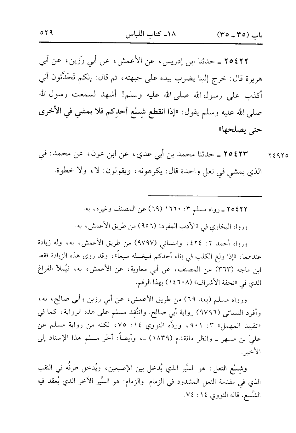 25422- حَدَّثَنَا ابْنُ إِدْرِيسَ ، عَنِ الأَعْمَشِ ، عَنْ أَبِي رَزِينٍ ، عَنْ أَبِي هُرَيْرَةَ ، قَالَ : خَرَجَ إِلَيْنَا يَضْرِبُ بِيَدِهِ عَلَى جَبْهَتِهِ ، ثُمَّ قَالَ : إِنَّكُمْ تُحَدِّثُونَ أَنِّي أَكْذِبُ عَلَى رَسُولِ اللهِ صَلَّى الله عَلَيْهِ وَسَلَّمَ ، أَشْهَدُ لَسَمِعْت رَسُولَ اللهِ صَلَّى الله عَلَيْهِ وَسَلَّمَ يَقُولُ : إِذَا انْقَطَعَ شِسْعُ أَحَدِكُمْ فَلاَ يَمْشِي فِي الأُخْرَى حَتَّى يُصْلِحَهَا.