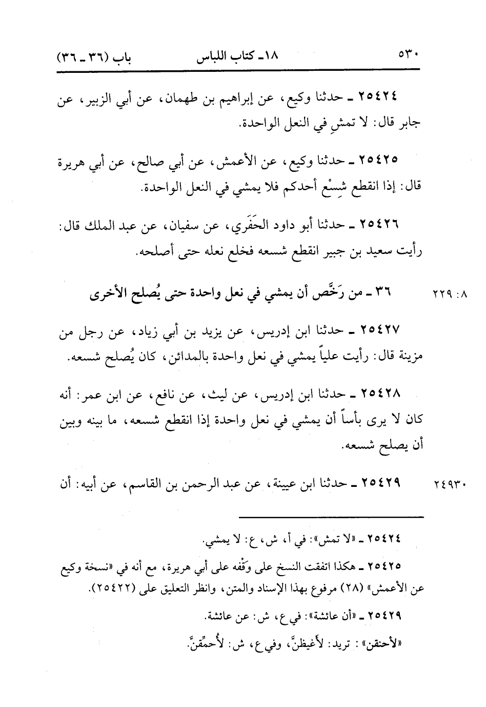 25426- حَدَّثَنَا أَبُو دَاوُدَ الْحَفَرِي ، عَنْ سُفْيَانَ ، عَنْ عَبْدِ الْمَلِكِ ، قَالَ : رَأَيْتُ سَعِيدَ بْنَ جُبَيْرٍ انْقَطَعَ شِسْعُهُ ، فَخَلَعَ نَعْلَهُ حَتَّى أَصْلَحَهُ. (8/228).