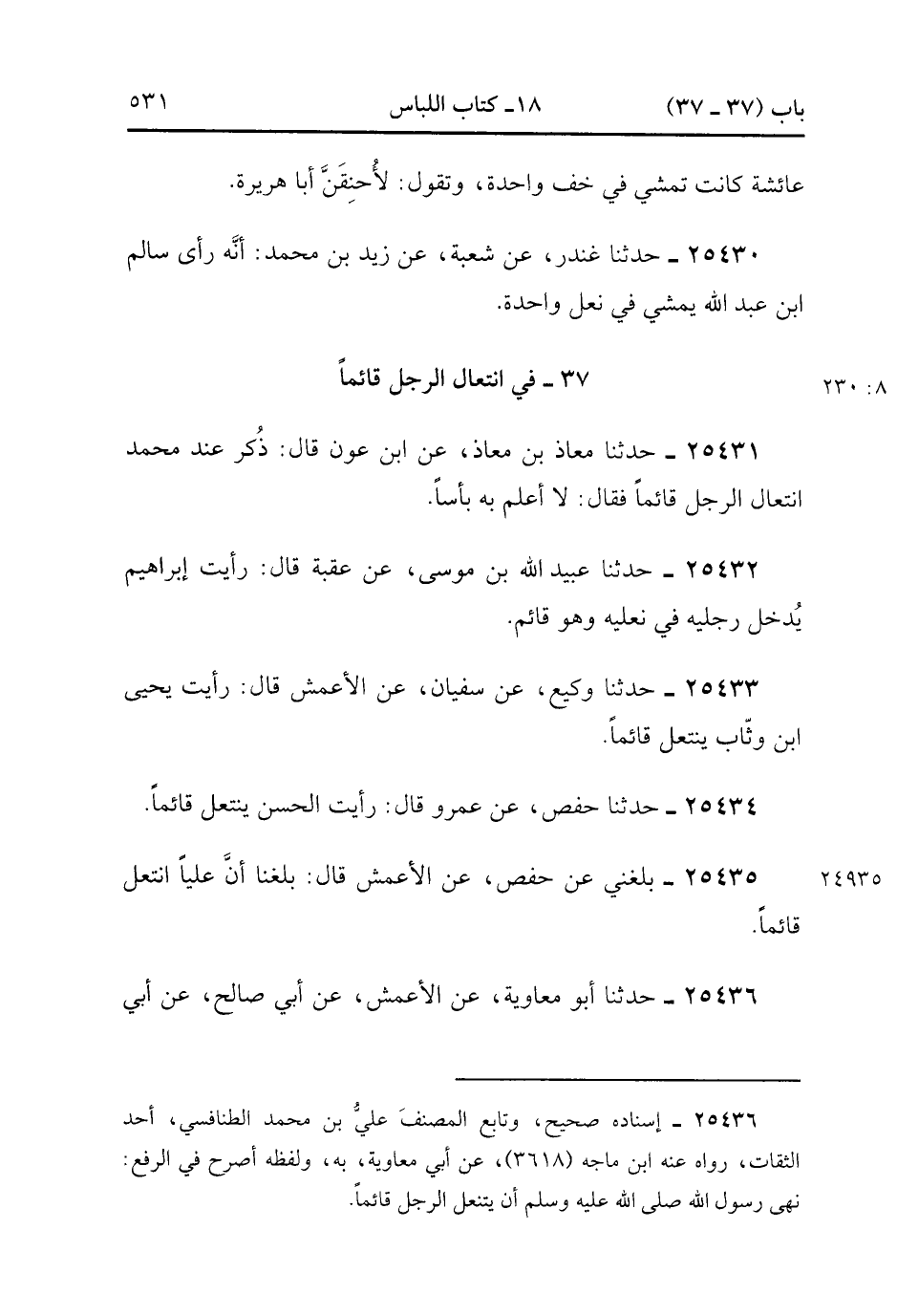 25433- حَدَّثَنَا وَكِيعٌ ، عَنْ سُفيَان ، عَنِ الأَعْمَشِ ، قَالَ : رَأَيْتُ يَحيَى بن وَثَاب يَنْتَعِلَ قَائِمًا.