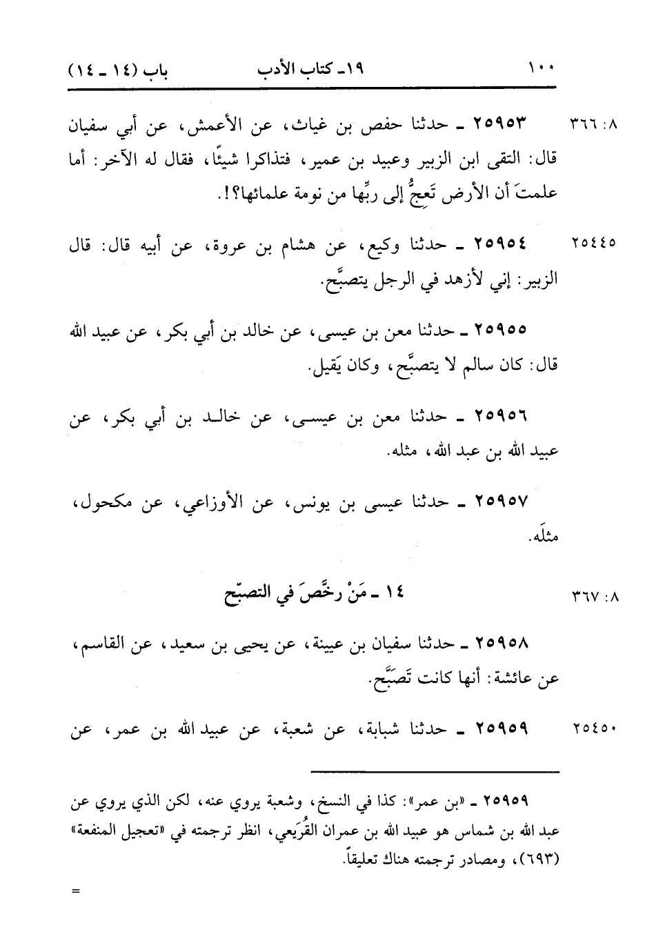 25959- حَدَّثَنَا شَبَابَةُ ، عَنْ شُعْبَةَ ، عَنْ عُبَيْدِ اللهِ بْنِ عُمَرَ ، عَنْ عَبْدِ اللهِ بْنِ الشَّمَّاسِ ، قَالَ : أَتَيْتُ أُمَّ سَلَمَةَ فَوَجَدْتهَا نَائِمَةً ، يَعْنِي بَعْدَ الصُّبْحِ. (8/367).