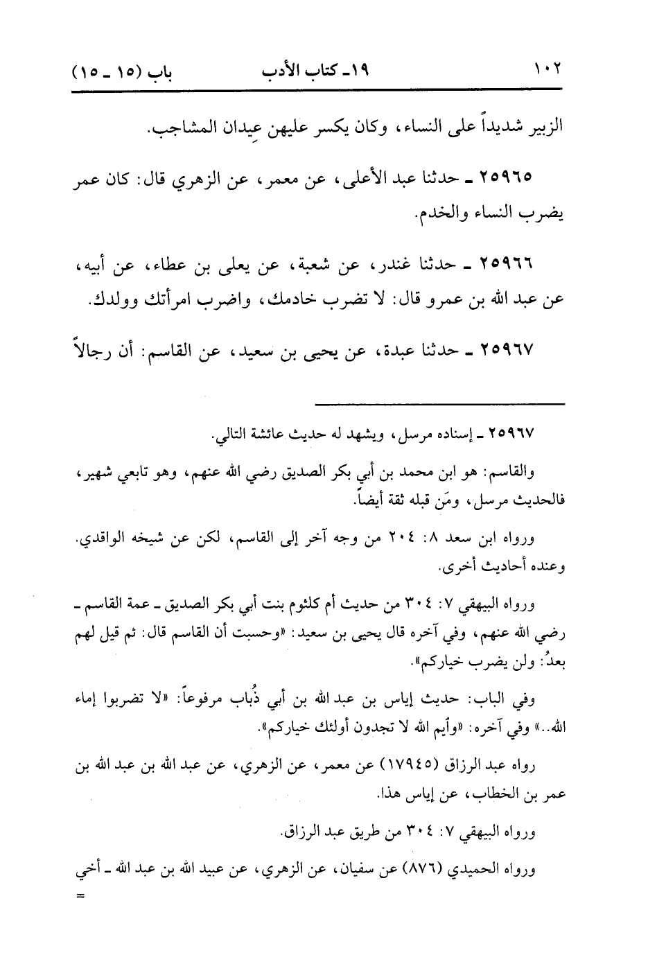 25966- حَدَّثَنَا غُنْدَرٌ ، عَنْ شُعْبَةَ ، عَنْ يَعْلَى بْنِ عَطَاءٍ ، عَنْ أَبِيهِ ، عَنْ عَبْدِ اللهِ بْنِ عَمَرو ، قَالَ : لاَ تَضْرِبْ خَادِمَك وَاضْرِبَ امْرَأَتَكَ وَوَلَدَكَ. (8/368).