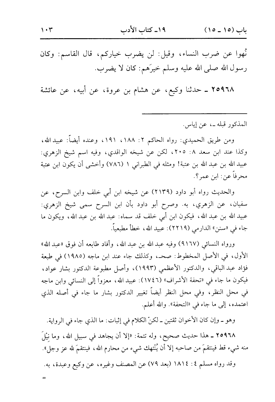 25968- حَدَّثَنَا وَكِيعٌ ، عَنْ هِشَامِ بْنِ عُرْوَةَ ، عَنْ أَبِيهِ ، عَنْ عَائِشَةَ ، قَالَتْ : مَا ضَرَبَ رَسُولُ اللهِ صَلَّى الله عَلَيْهِ وَسَلَّمَ خَادِمًا لَهُ ، وَلاَ امْرَأَةً ، وَلاَ ضَرَبَ شَيْئًا بِيَدِهِ. (8/368).