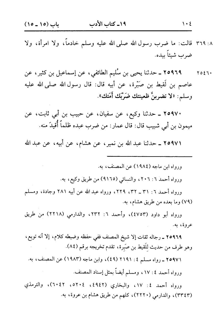 25969- حَدَّثَنَا يَحْيَى بْنُ سُلَيْمٍ الطَّائِفِيُّ ، عَنْ إسْمَاعِيلَ بْنِ كَثِيرٍ ، عَنْ عَاصِمِ بْنِ لَقِيطِ بْنِ صَبِرَةَ ، عَنْ أَبِيهِ ، قَالَ : قَالَ رَسُولُ اللهِ صَلَّى الله عَلَيْهِ وَسَلَّمَ : لاَ تَضْرِبَنَّ ظَعِينَتَكَ ضَرْبَك أَمَتِكَ.