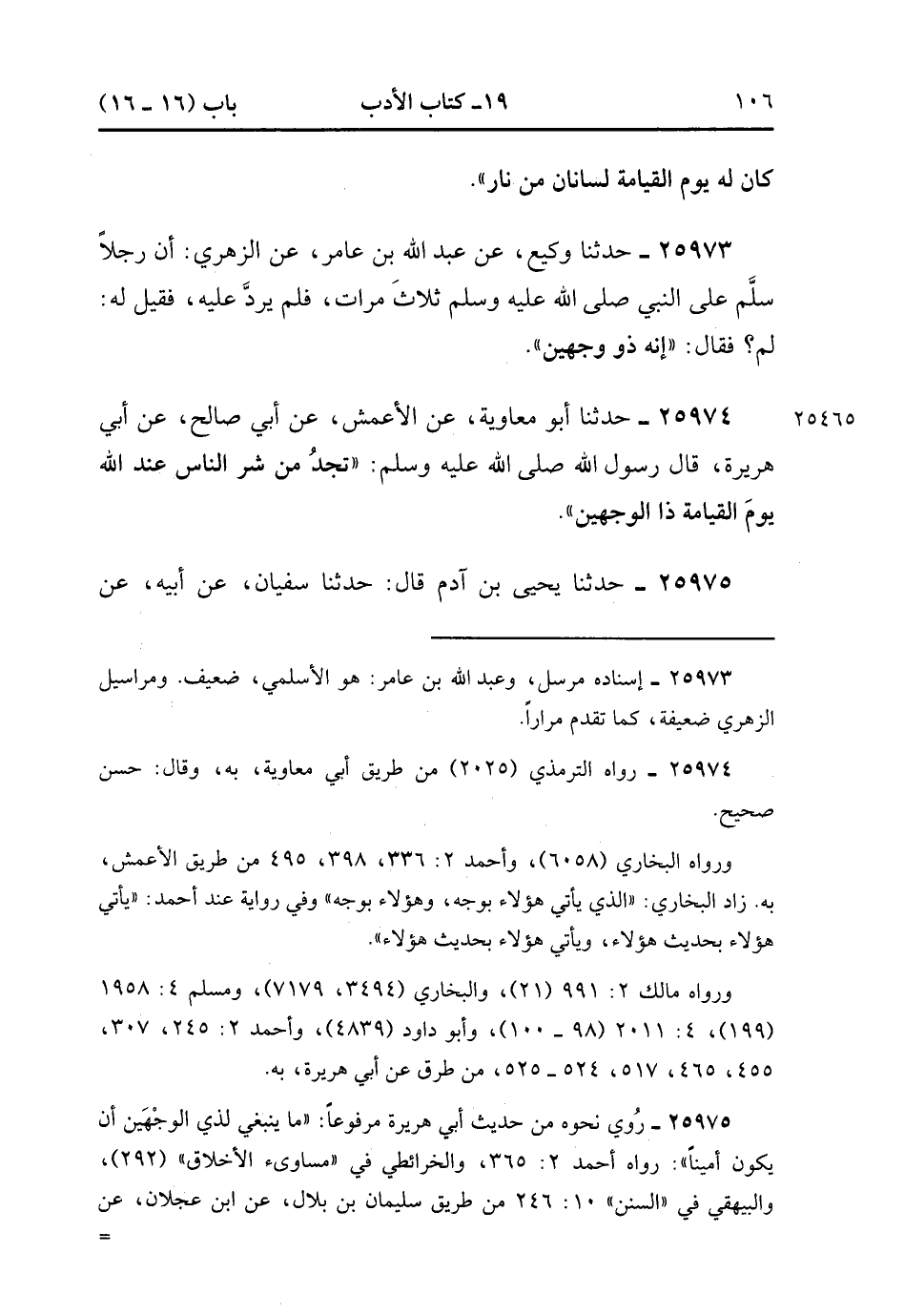 25974- حَدَّثَنَا أَبُو مُعَاوِيَةَ ، عَنِ الأَعْمَشِ ، عَنْ أَبِي صَالِحٍ ، عَنْ أَبِي هُرَيْرَةَ ، قَالَ رَسُولُ اللهِ صَلَّى الله عَلَيْهِ وَسَلَّمَ : تَجِدُ مِنْ شَرِّ النَّاسِ عِنْدَ اللهِ يَوْمَ الْقِيَامَةِ ذُو الْوَجْهَيْنِ.