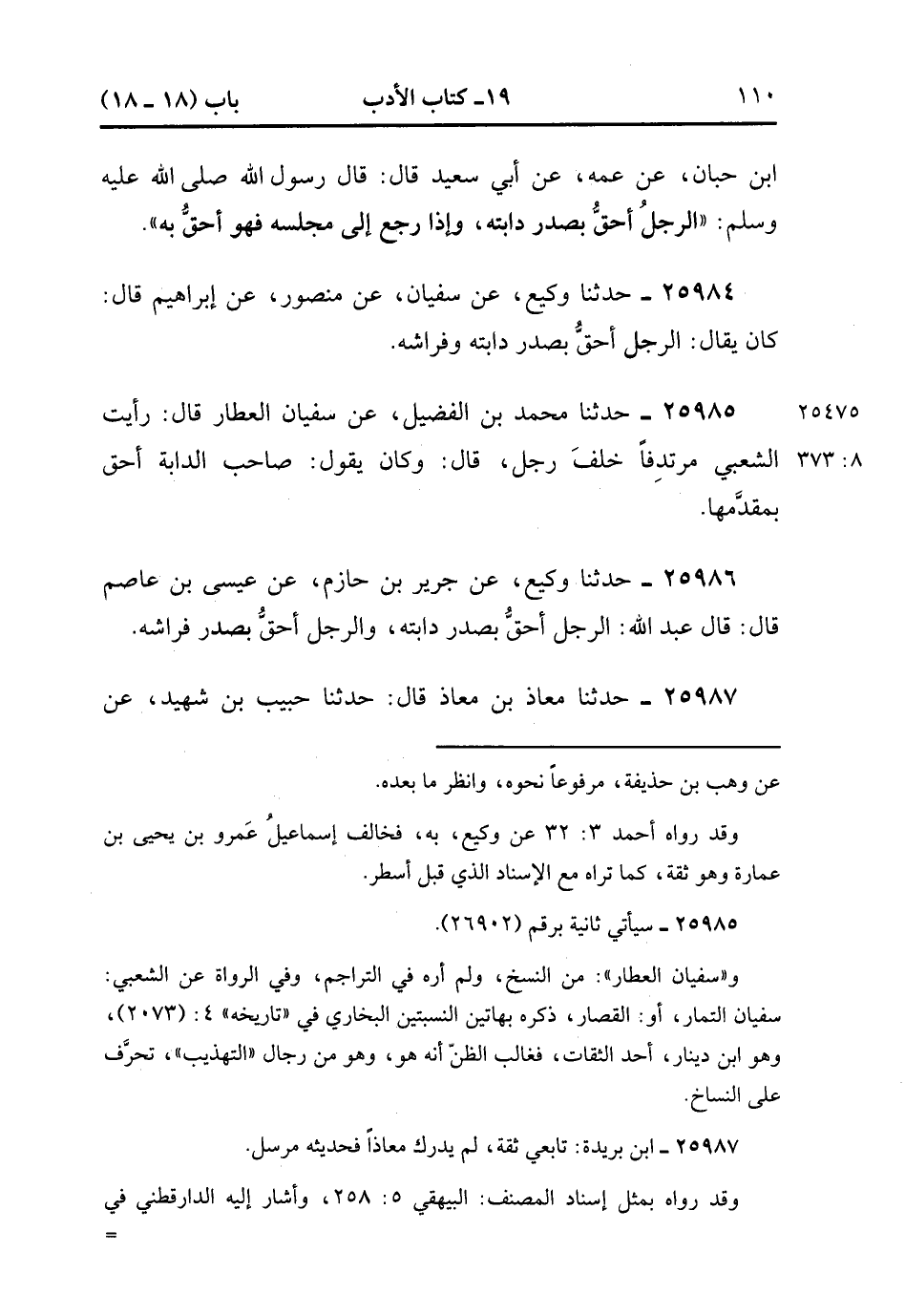 25984- حَدَّثَنَا وَكِيعٌ ، عَنْ سُفْيَانَ ، عَنْ مَنْصُورٍ ، عَنْ إبْرَاهِيمَ ، قَالَ : كَانَ يُقَالَ : الرَّجُلُ أَحَقُّ بِصَدْرِ دَابَّتِهِ وَفِرَاشِهِ.