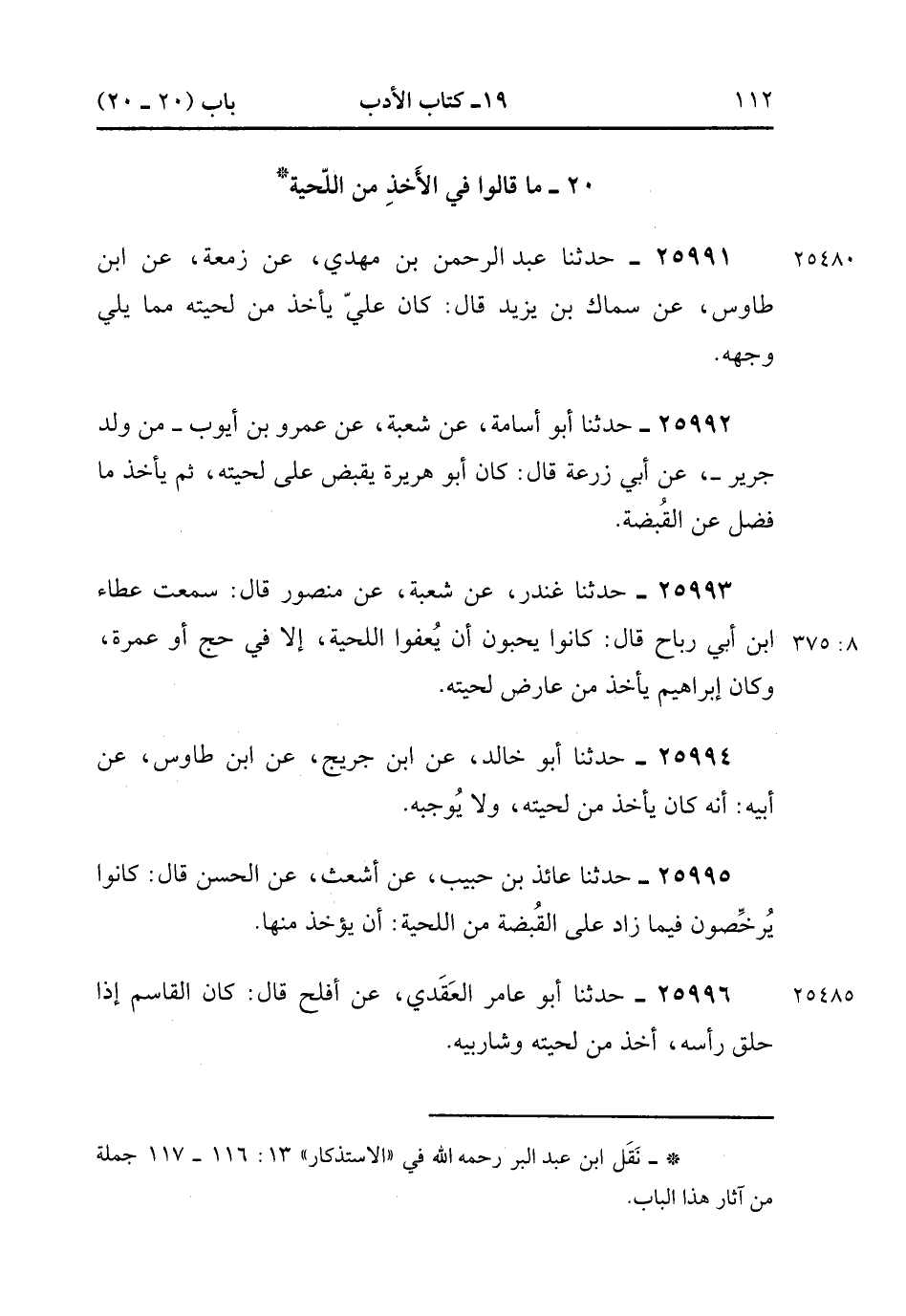25993- حَدَّثَنَا غُنْدَرٌ ، عَنْ شُعْبَةَ ، عَنْ مَنْصُورٍ ، قَالَ : سَمِعْتُ عَطَاءَ بْنَ أَبِي رَبَاحٍ ، قَالَ : كَانُوا يُحِبُّونَ أَنْ يُعْفُوا اللِّحْيَةَ إلاَّ فِي حَجٍّ ، أَوْ عُمْرَةٍ ، وَكَانَ إبْرَاهِيمُ يَأْخُذُ مِنْ عَارِضِ لِحْيَتِهِ. (8/374).