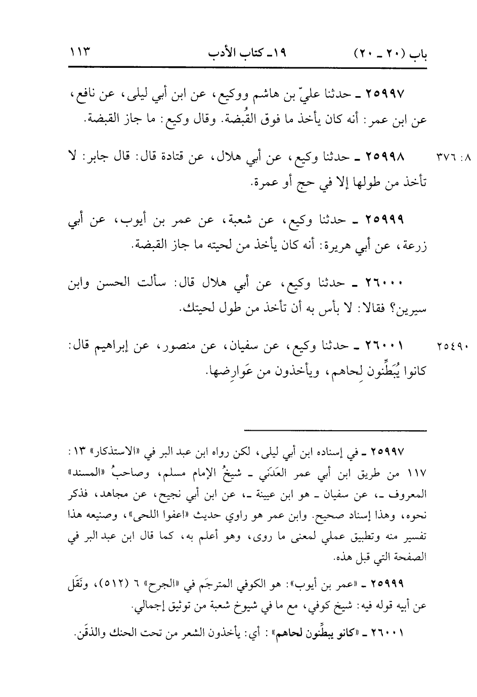 26001- حَدَّثَنَا وَكِيعٌ ، عَنْ سُفْيَانَ ، عَنْ مَنْصُورٍ ، عَنْ إبْرَاهِيمَ ، قَالَ : كَانُوا يُبَطِّنُونَ لِحَاهُمْ وَيَأْخُذُونَ مِنْ عَوَارِضِهَا. (8/376).