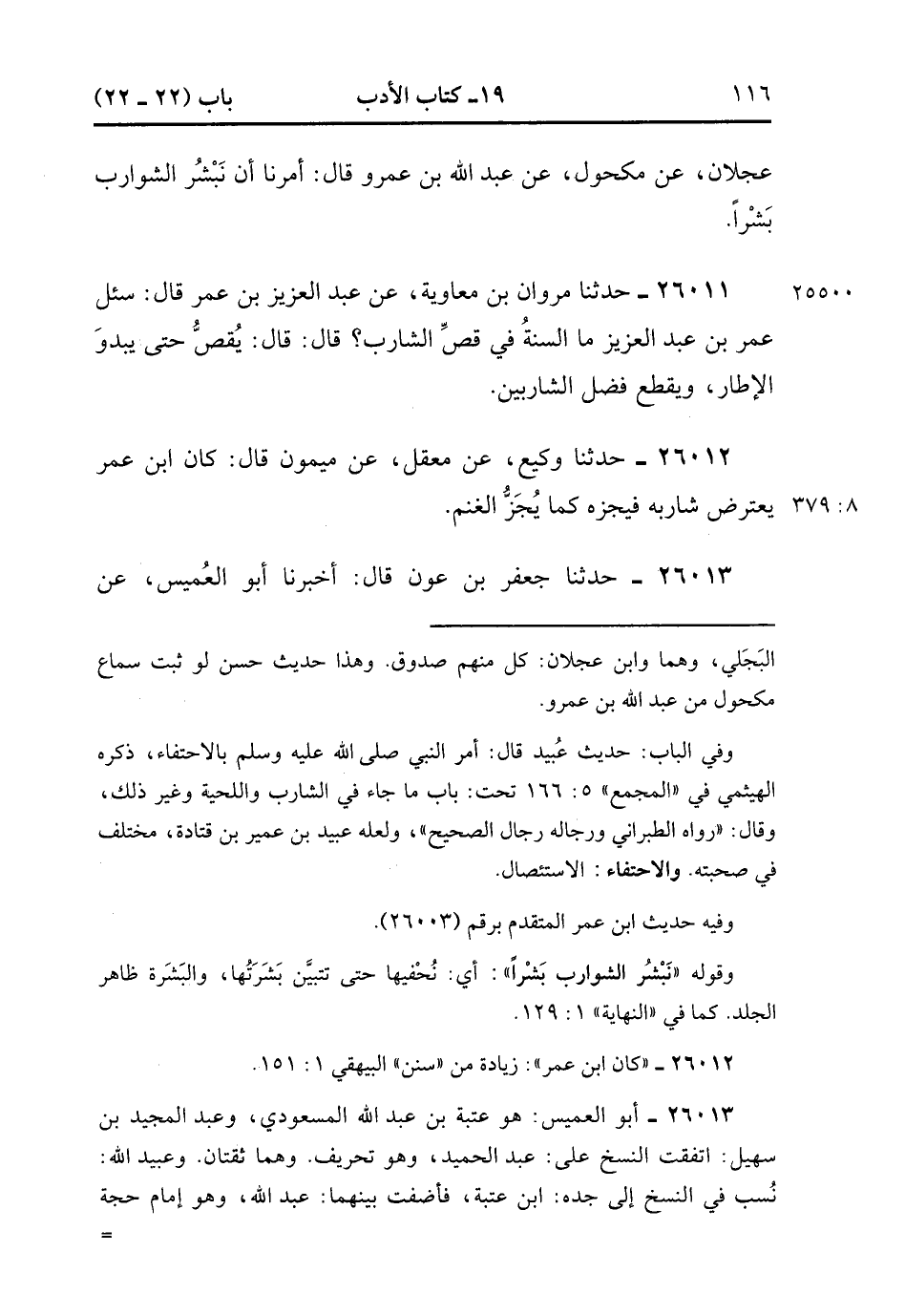 26010- حَدَّثَنَا إِسْحَاقُ بْنُ مَنْصُورٍ , قَالَ : حدَّثَنَا هُرَيْمٌ ، عَنِ ابْنِ عَجْلاَنَ ، عَنْ مَكْحُولٍ ، عَنْ عَبْدِ اللهِ بْنِ عَمْرٍو ، قَالَ : أُمِرْنَا أَنْ نَبْشُرَ الشَّوَارِبَ بَشْرًا.