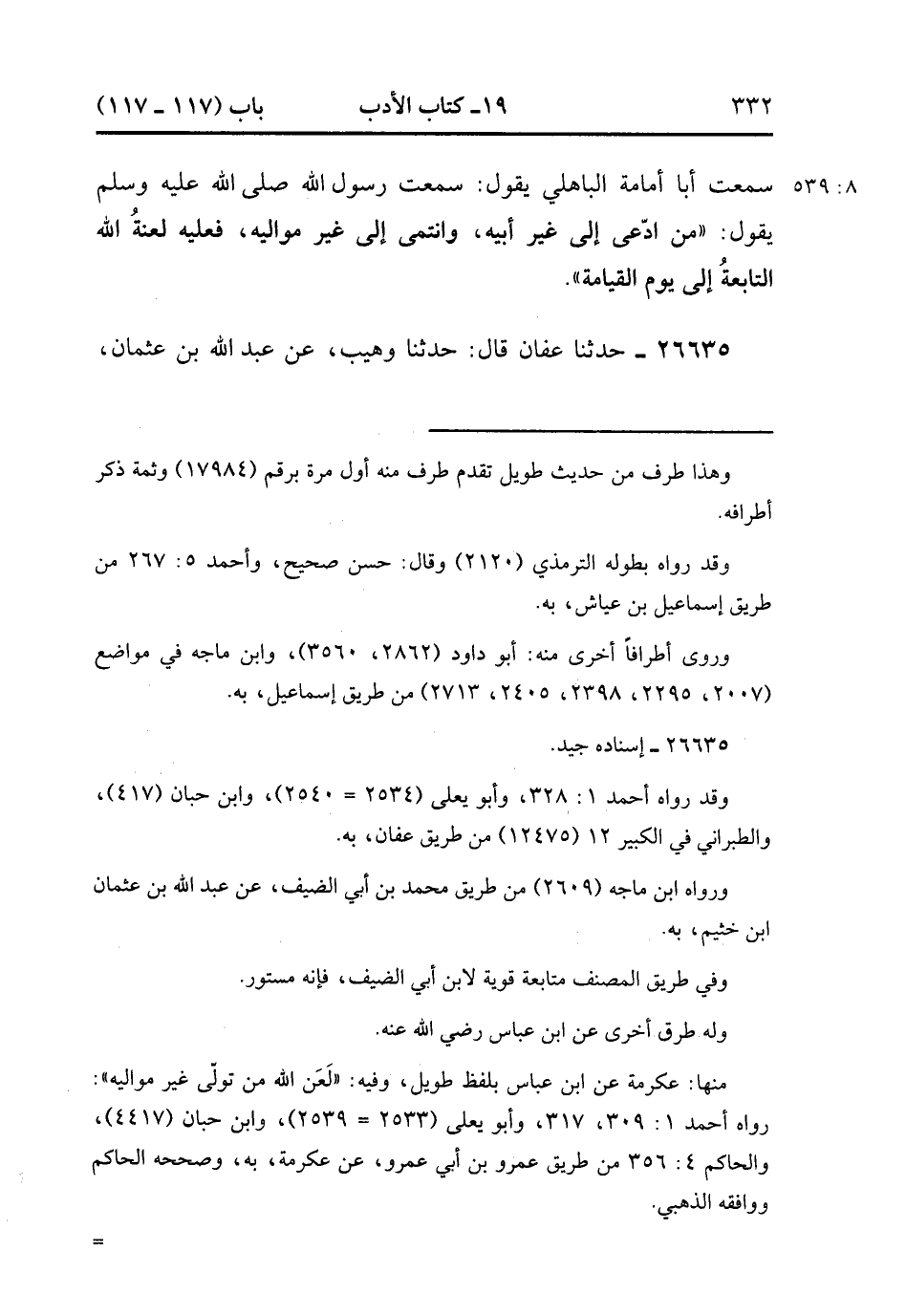 26635- حَدَّثَنَا عَفَّانُ , قَالَ : حدَّثَنَا وُهَيْبٌ ، عَنْ عَبْدِ اللهِ بْنِ عُثْمَانَ ، عَنْ سَعِيدِ بْنِ جُبَيْرٍ ، عَنِ ابْنِ عَبَّاسٍ ، عَنِ النَّبِيِّ صَلَّى الله عَلَيْهِ وَسَلَّمَ ، قَالَ : مَنِ ادَّعَى إلَى غَيْرِ أَبِيهِ ، أَوْ تَوَلَّى غَيْرَ مَوَالِيهِ , فَعَلَيْهِ لَعَنَةُ اللهِ وَالْمَلاَئِكَةِ وَالنَّاسِ أَجْمَعِينَ. (8/539).