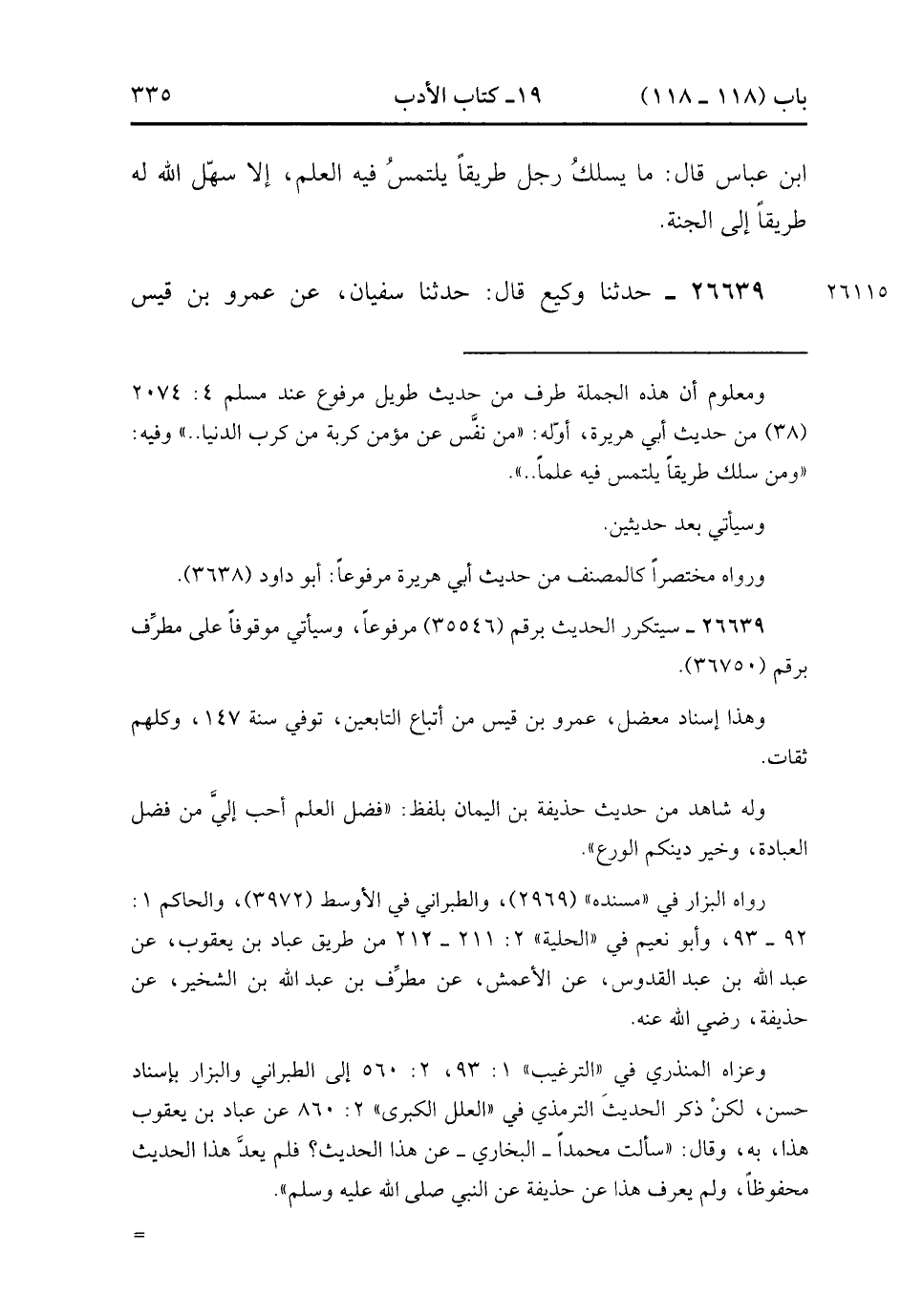 26639- حَدَّثَنَا وَكِيعٌ , قَالَ : حدَّثَنَا سُفْيَانُ ، عَنْ عَمْرِو بْنِ قَيْسٍ الْمُلاَئِيِّ ، قَالَ : قَالَ رَسُولُ اللهِ صَلَّى الله عَلَيْهِ وَسَلَّمَ : فَضْلُ الْعِلْمِ خَيْرٌ مِنْ فَضْلِ الْعِبَادَةِ ، وَمِلاَكُ دِينِكُمُ الْوَرَعُ. (8/540).