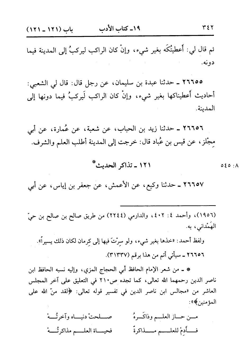 26656- حَدَّثَنَا زَيْدُ بْنُ الْحُبَابِ ، عَنْ شُعْبَةَ ، عَنْ عُمَارَةَ ، عَنْ أَبِي مِجْلَزٍ ، عَنْ قَيْسِ بْنِ عُبَادٍ ، قَالَ : خَرَجْت إلَى الْمَدِينَةِ أَطْلُبُ الْعِلْمَ وَالشَّرَفَ. (8/544).