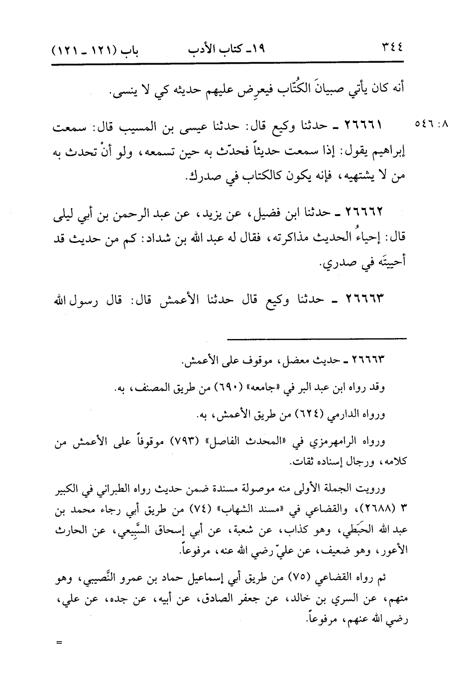 26662- حَدَّثَنَا ابْنُ فُضَيْلٍ ، عَنْ يَزِيدَ ، عَنْ عَبْدِ الرَّحْمَنِ بْنِ أَبِي لَيْلَى ، قَالَ : إحْيَاءُ الْحَدِيثِ مُذَاكَرَتُهُ ، فَقَالَ لَهُ عَبْدُ اللهِ بْنُ شَدَّادٍ : كَمْ مِنْ حَدِيثٍ قَدْ أَحْيَيْته فِي صَدْرِي. (8/546).