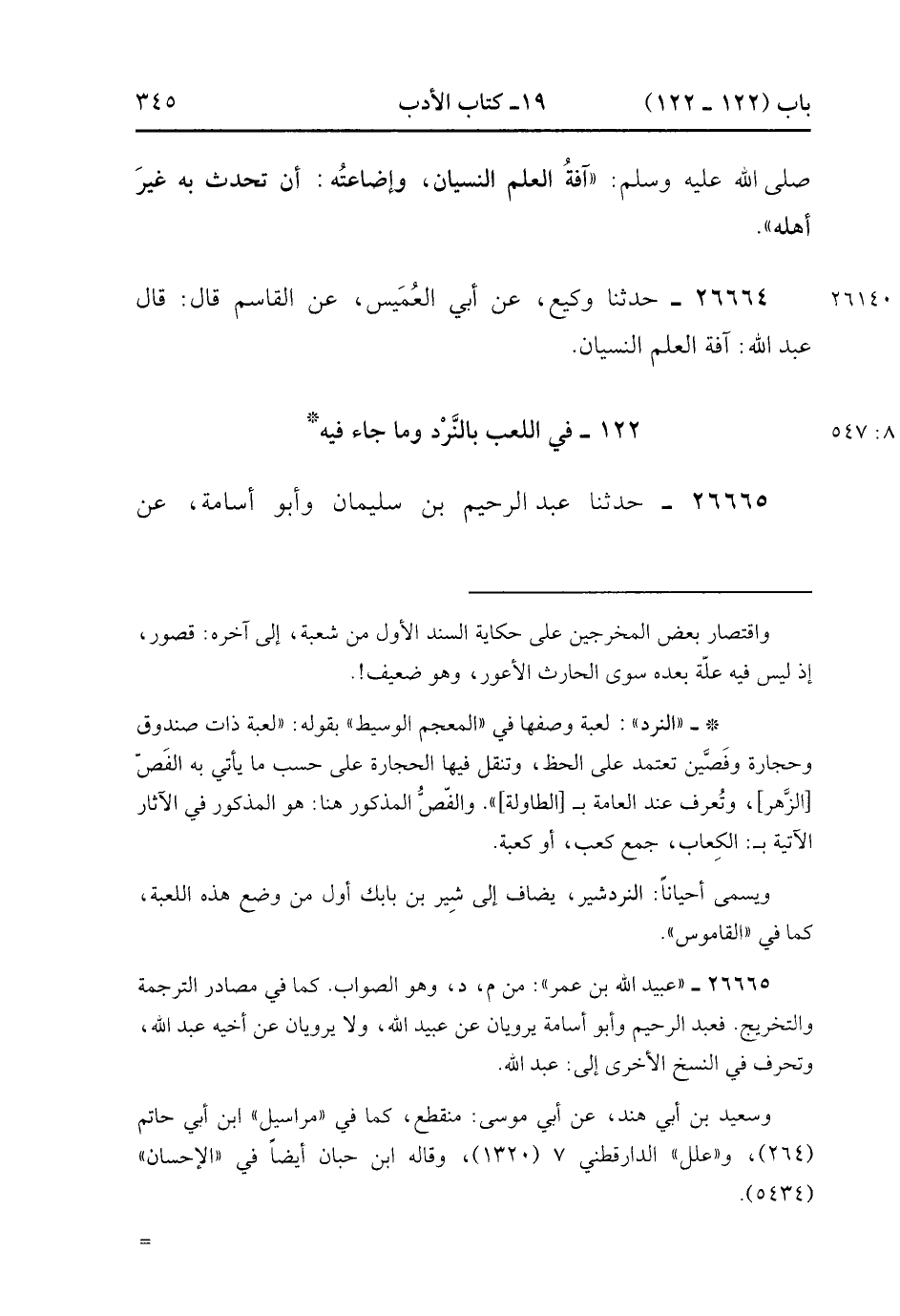 26664- حَدَّثَنَا وَكِيعٌ ، عَنْ أَبِي الْعُمَيْسِ ، عَنِ الْقَاسِمِ ، قَالَ : قَالَ عَبْدُ اللهِ : آفَةُ الْعِلْمِ النِّسْيَانُ. (8/546).
