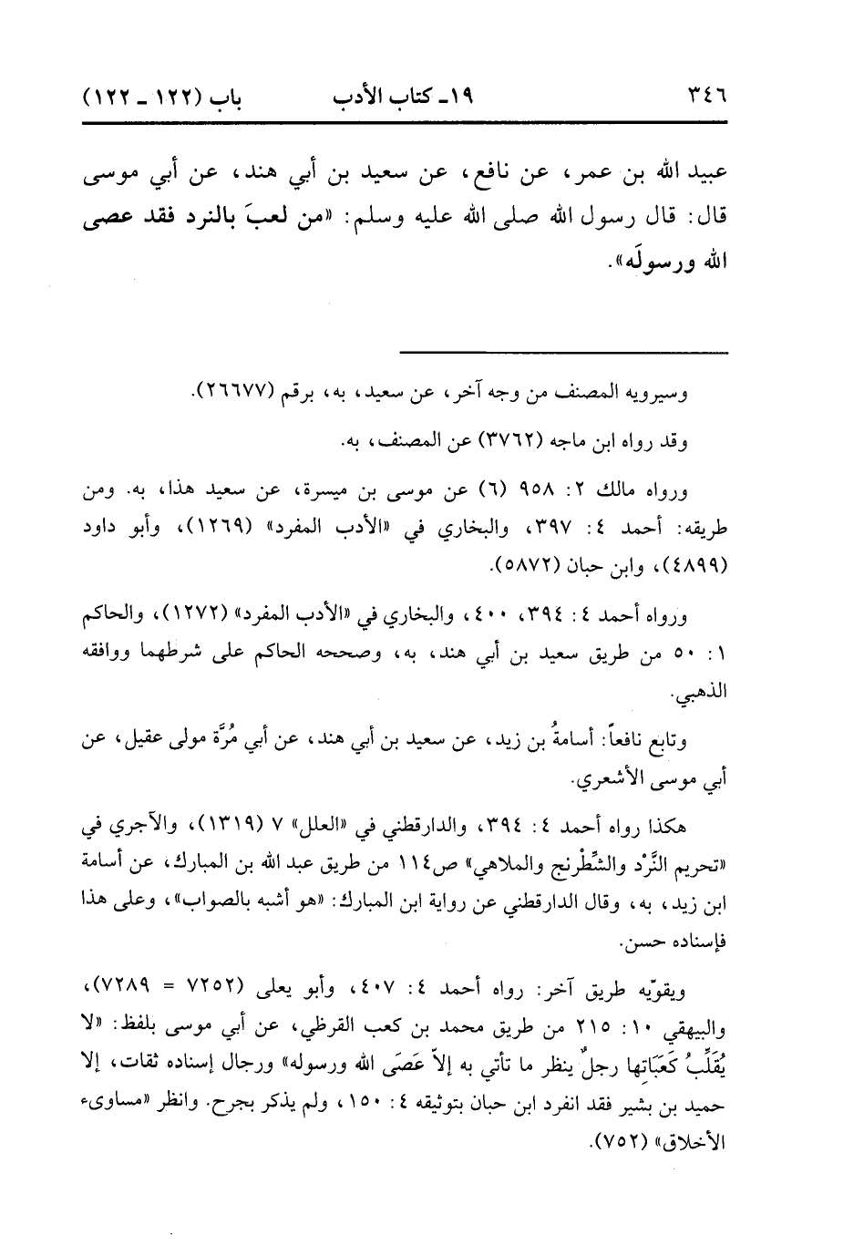 26665- حَدَّثَنَا عَبْدُ الرَّحِيمِ بْنُ سُلَيْمَانَ ، وَأَبُو أُسَامَةَ ، عَنْ عُبَيْدِ اللهِ بْنِ عُمَرَ ، عَنْ نَافِعٍ ، عَنْ سَعِيدِ بْنِ أَبِي هِنْدٍ ، عَنْ أَبِي مُوسَى ، قَالَ : قَالَ رَسُولُ اللهِ صَلَّى الله عَلَيْهِ وَسَلَّمَ : مَنْ لَعِبَ بِالنَّرْدِ ، فَقَدْ عَصَى اللَّهَ وَرَسُولَهُ. (8/547).