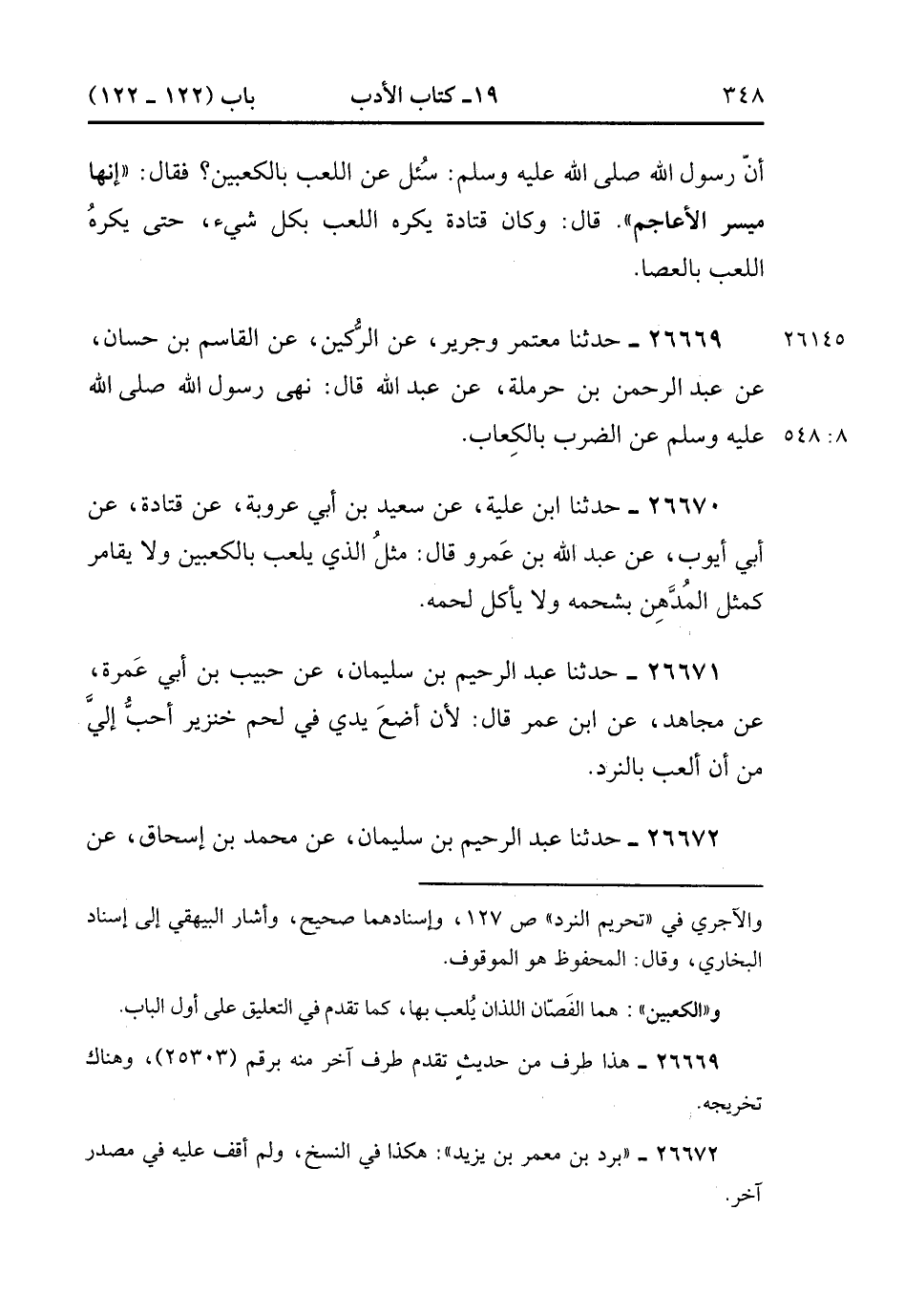 26669- حَدَّثَنَا مُعْتَمِرٌ وَجَرِيرٌ ، عَنِ الرُّكَيْنِ ، عَنِ الْقَاسِمِ بْنِ حَسَّانَ ، عَنْ عَبْدِ الرَّحْمَنِ بْنِ حَرْمَلَةَ ، عَنْ عَبْدِ اللهِ ، قَالَ : نَهَى رَسُولُ اللهِ صَلَّى الله عَلَيْهِ وَسَلَّمَ ، عَنِ الضَّرْبِ بِالْكِعَابِ. (8/547).