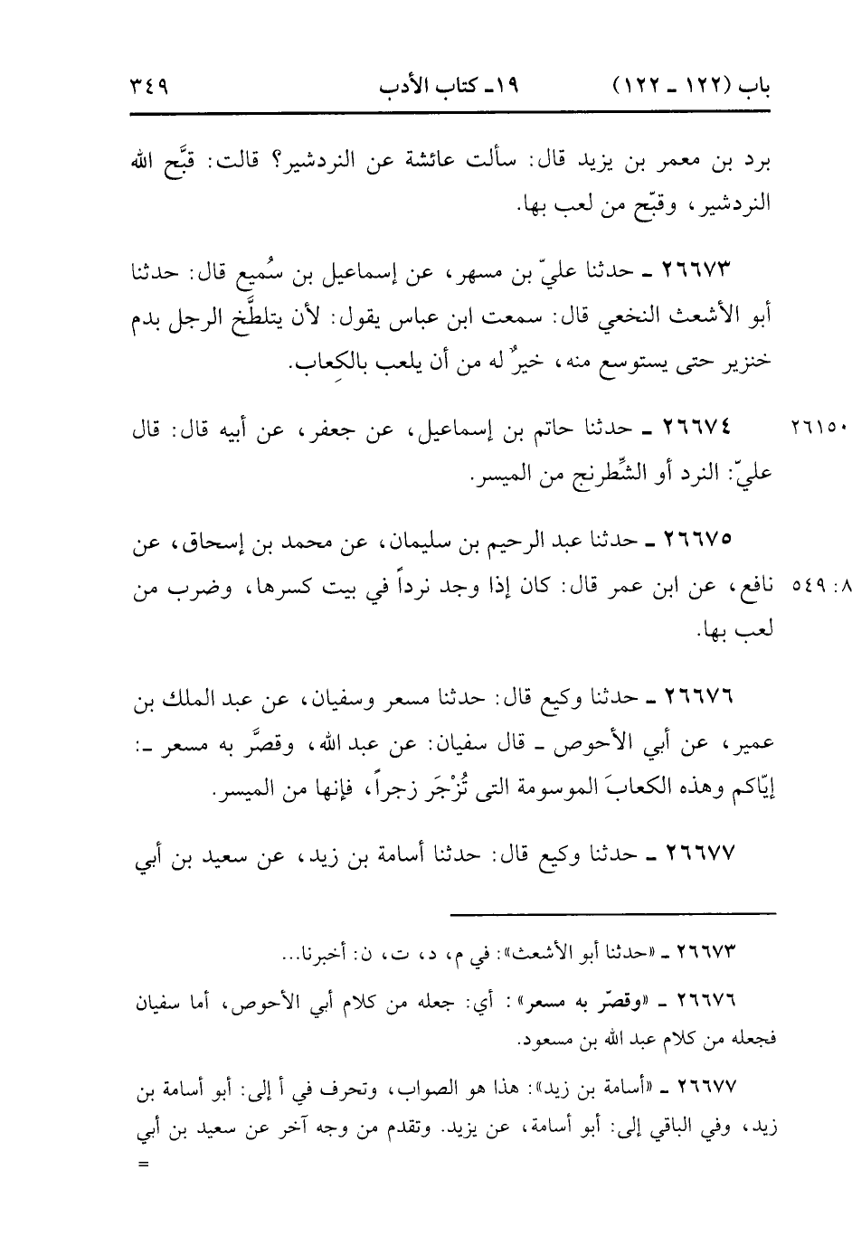 26676- حَدَّثَنَا وَكِيعٌ , قَالَ : حدَّثَنَا مِسْعَرٌ وَسُفْيَانُ ، عَنْ عَبْدِ الْمَلِكِ بْنِ عُمَيْرٍ ، عَنْ أَبِي الأَحْوَصِ ، قَالَ سُفْيَانُ : عَنْ عَبْدِ اللهِ ، وَقَصَّرَ بِهِ مِسْعَرٌ : إيَّاكُمْ وَهَذِهِ الْكِعَابَ الْمَوْسُومَةَ الَّتِي تُزْجَرُ زَجْرًا ، فَإِنَّهَا مِنَ الْمَيْسِرِ. (8/549).