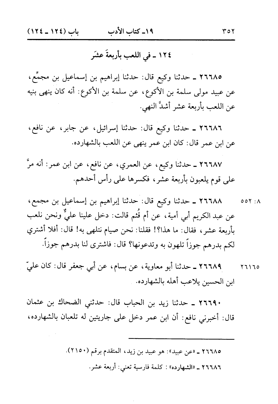 26685- حَدَّثَنَا وَكِيعٌ , قَالَ : حدَّثَنَا إبْرَاهِيمُ بْنُ إسْمَاعِيلَ بْنُ مُجَمِّعٍ ، عَنْ عُبَيْدٍ مَوْلَى سَلَمَةَ بْنِ الأَكْوَعِ ، عن سَلَمَةَ بْنِ الأَكْوَعِ أَنَّهُ كَانَ يَنْهَى بَنِيهِ عَنِ اللَّعِبِ بِأَرْبَعَةَ عَشَرَ أَشَدَّ النَّهْيِ.