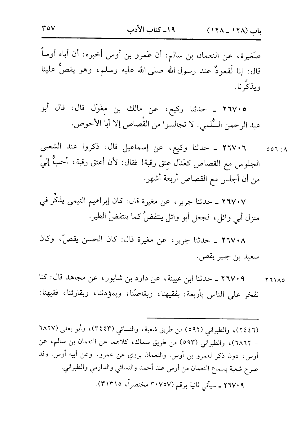 26705- حَدَّثَنَا وَكِيعٌ ، عَنْ مَالِكِ بْنِ مِغْوَلٍ ، قَالَ : قَالَ أَبُو عَبْدِ الرَّحْمَنِ السُّلَمِيُّ : لاَ تُجَالِسُوا مِنَ الْقُصَّاصِ إلاَّ أَبَا الأَحْوَصِ. (8/555).